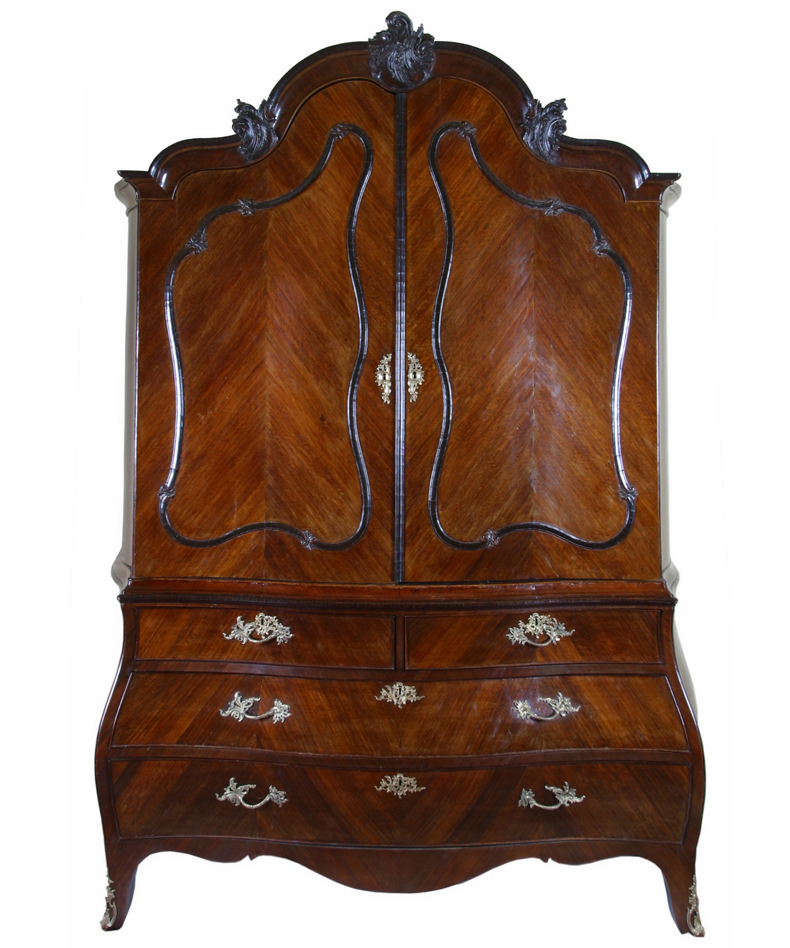 An exceptional cabinet that in various aspects differs from the average cabinet. The shape of the top, as well as tthe whirled crestings are different. The shape of the doorpannels is very extravagant, but complement the top very well. The lower part holds two short and two long drawers.The lower part of the cabinet does not stand on claw and ball feet, but on short cabriole leg with little brass sabots. The cabinet is veneered in a fish-bone motive with the expensive Indonesian wood type purplewood.