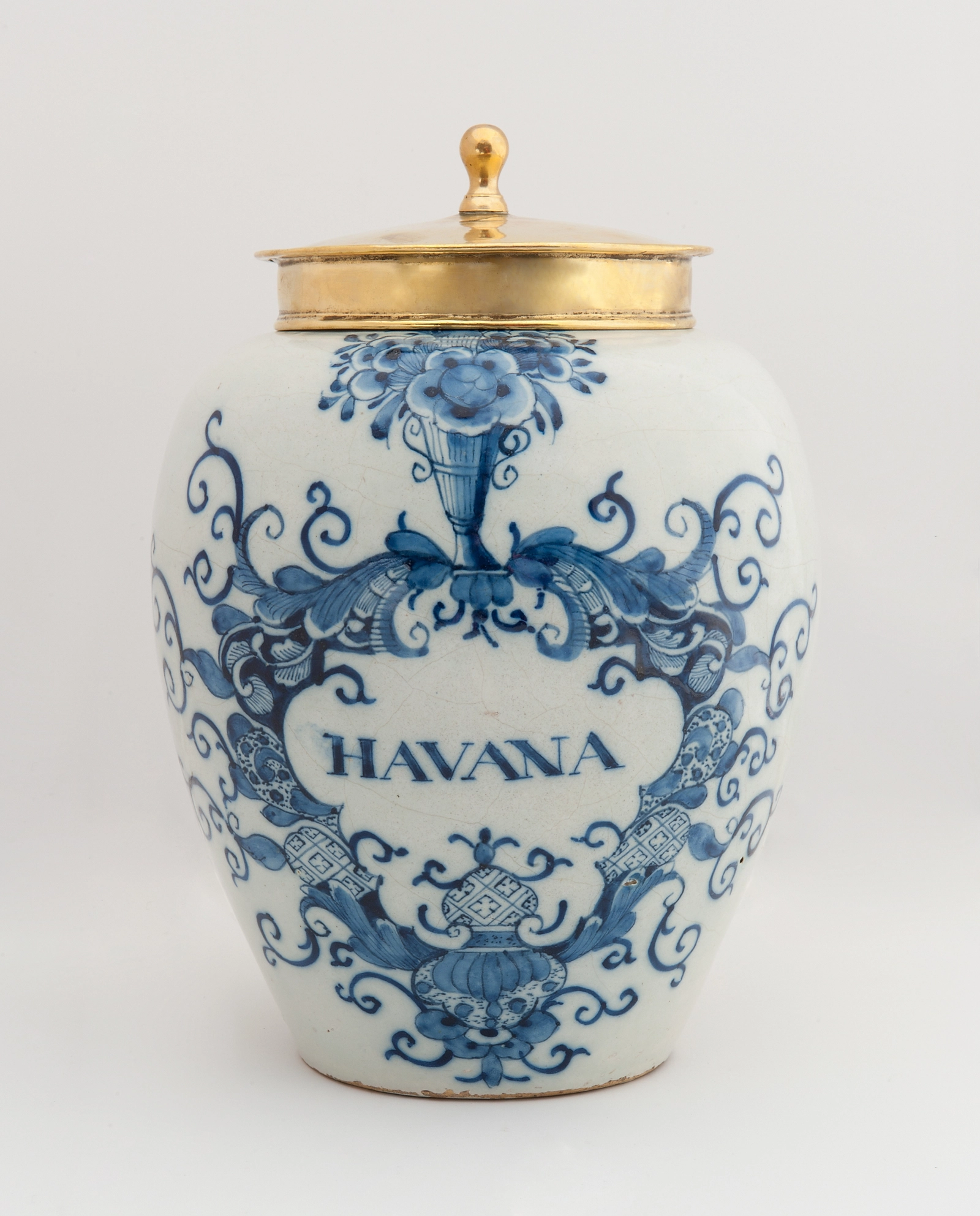 The ovoid body inscribed on the front with « HAVANA » within a cartouche formed by a flower filled vase with foliate scrolls, leafs and lines. With a later brass cover.