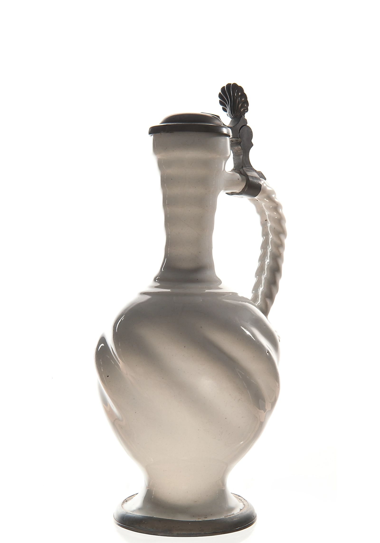 Diagonally twisted, bulbous jug resting on a tin standing area, with a trumpet-shaped neck. With a string beaten ear.