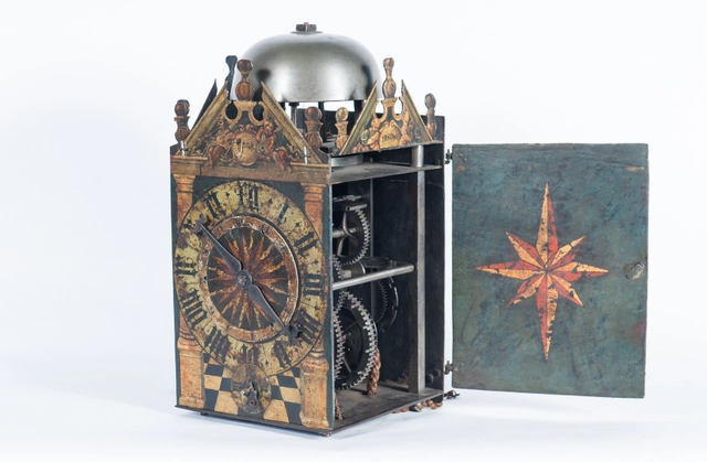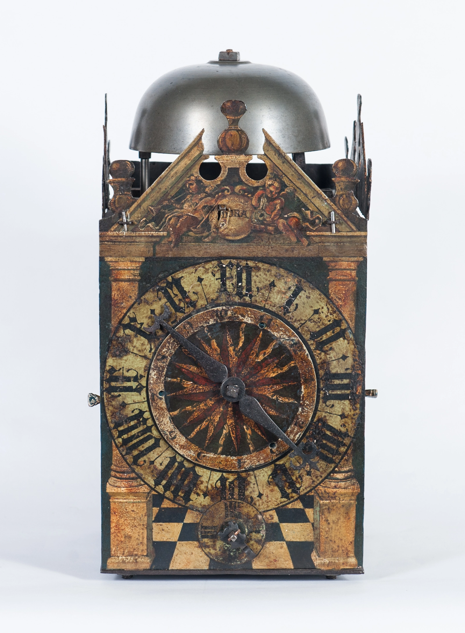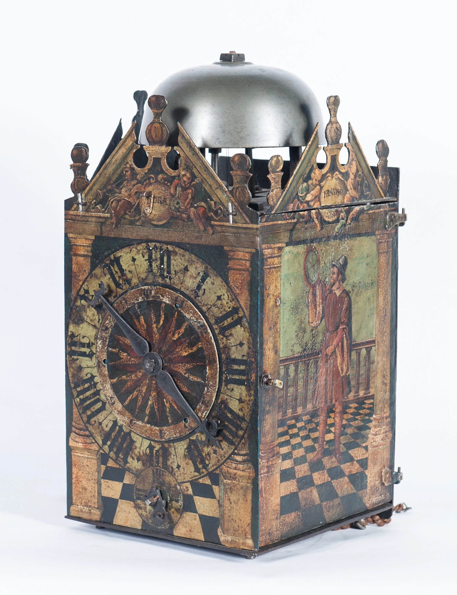 A good Dutch Geldern polychrome painted alarm 'stoelklok', by Goslink Ruempol, 1746