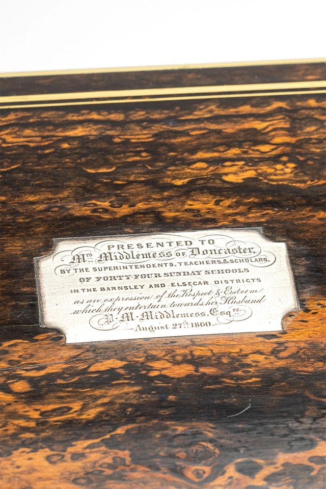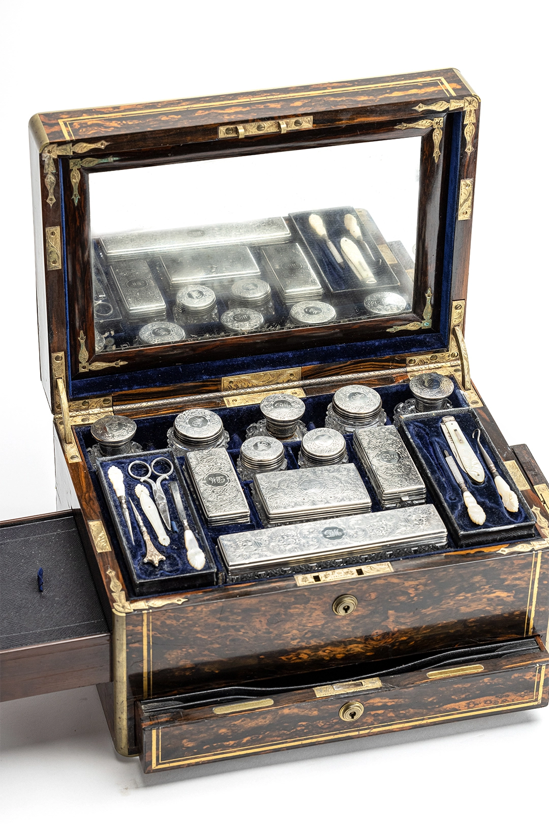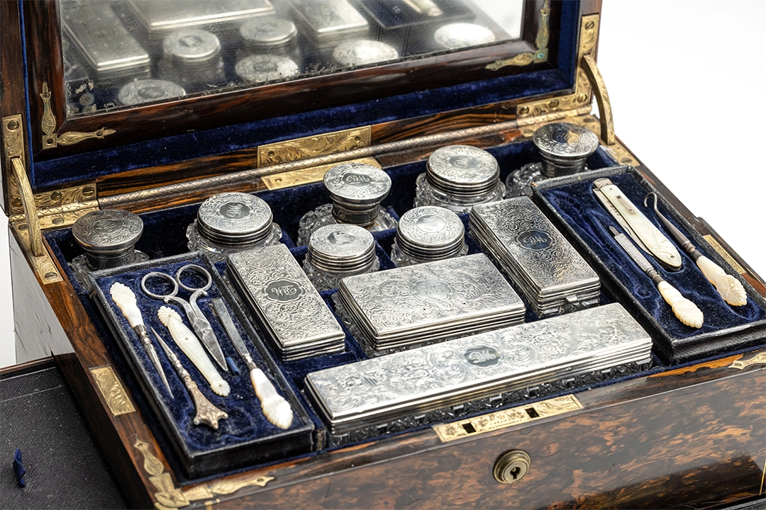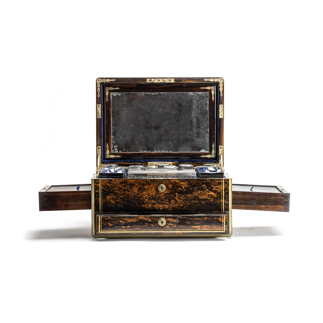 This is a very nice high-quality Victorian traveling beauty case, fit for the happy few. The magnificent interior is filled with secret compartments and charming little crystal perfume bottles, as well as other tools and boxes to help you store all you would need for a longer trip. The interior is 95% complete, and there's even a secret compartment behind the mirror for love letters. On top of the exotic wooden case, there is a silver plaque from the first owner.The dimensions of the case are a height of 31cm, a depth of 25.5cm, and a width of 35cm.