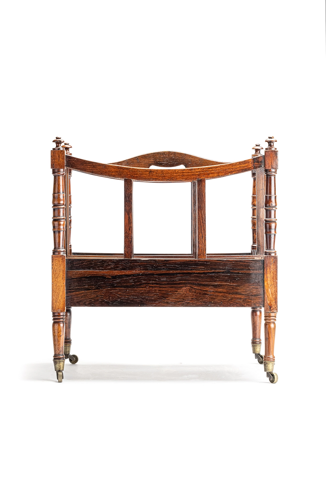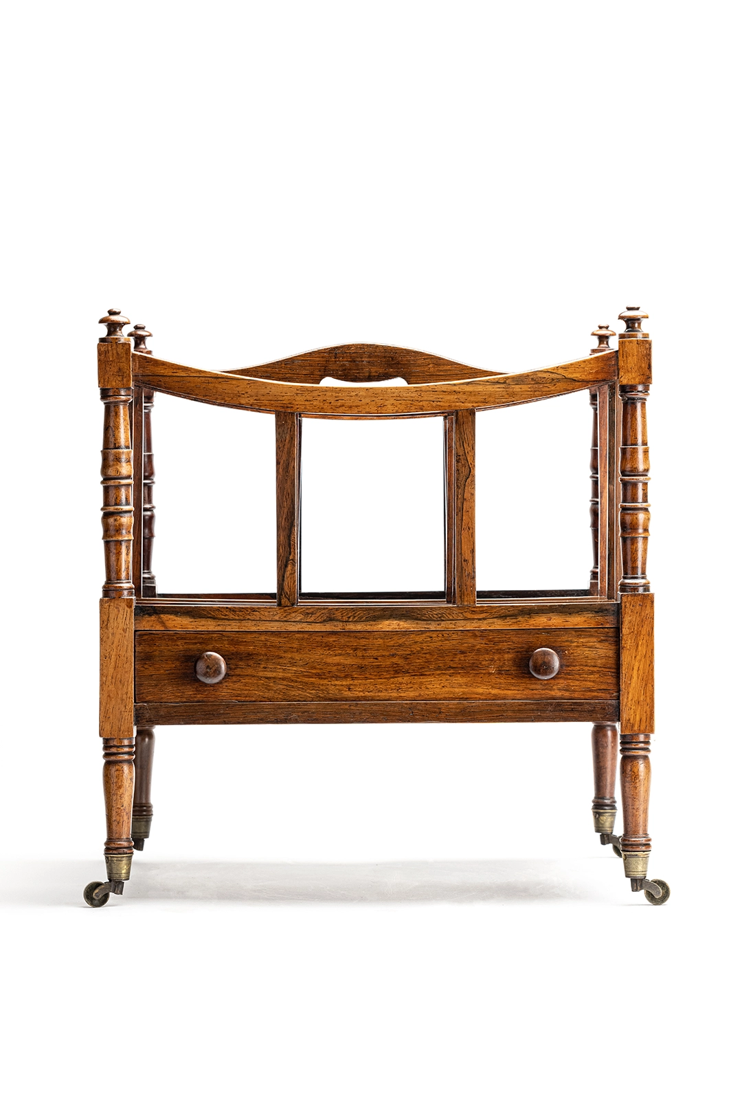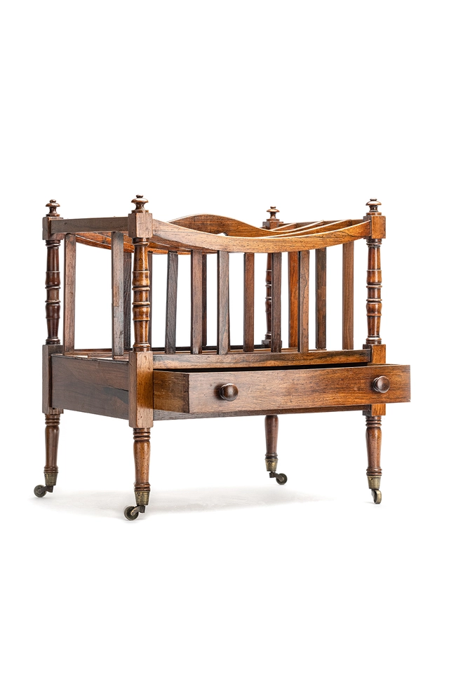 This good-looking Edwardian Canterbury magazine rack, which is English in origin and dates back to circa 1880, is in good condition and features wheels for easy mobility. It also has a separate drawer underneath for added functionality.