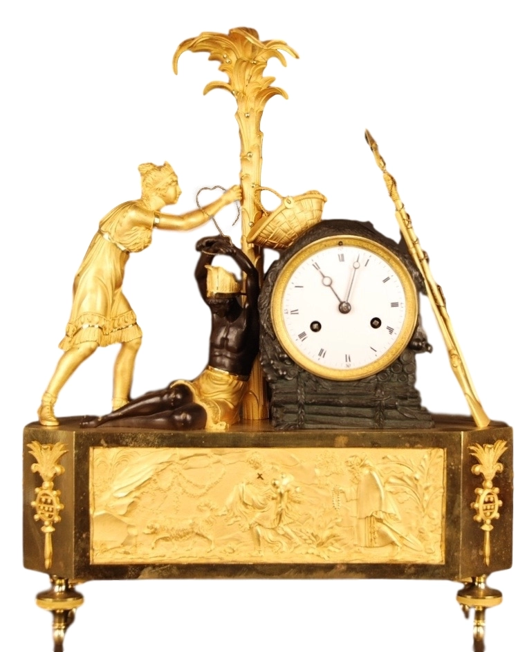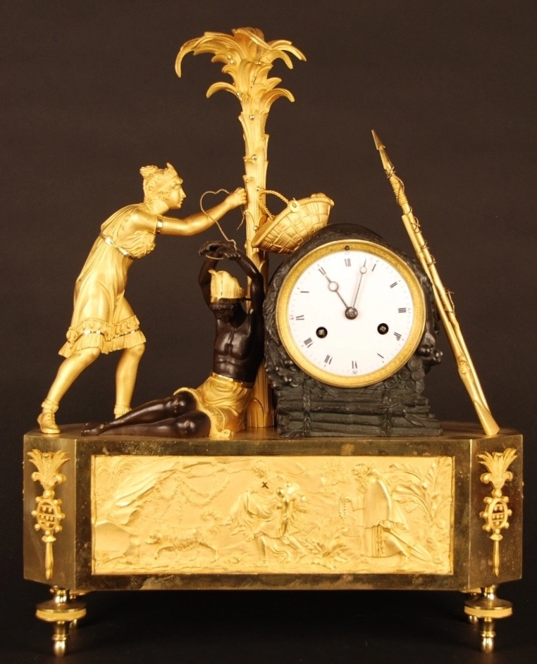 This wonderful clock case is one of a number that relate to the notion of ‘Le Bon Sauvage’ as evoked by the writings of Jean-Jacques Rousseau. The design for this specific model is based on the celebrated epic ‘Atala’ by François-René de Chateaubriand (1768-1848), first published in 1801. Napoleon, who was determined to effect a reconciliation between Church and State, welcomed the support that it gave to his Concordat and in gratitude appointed Chateaubriand his first secretary at the French Embassy in Rome. The public adored ‘Atala’; between 1801 and 1805 eleven editions appeared and translations were published as far a field as Russia and Hungary. Chateaubriand’s heroine, Atala inspired all forms of the arts, from ballads, paintings, engravings, wax works and as here clock cases.