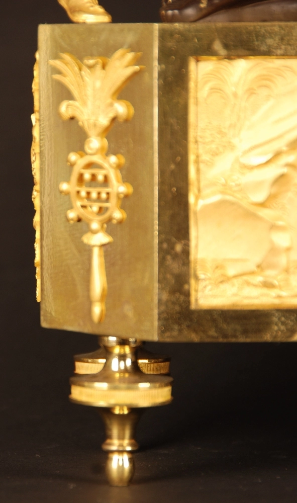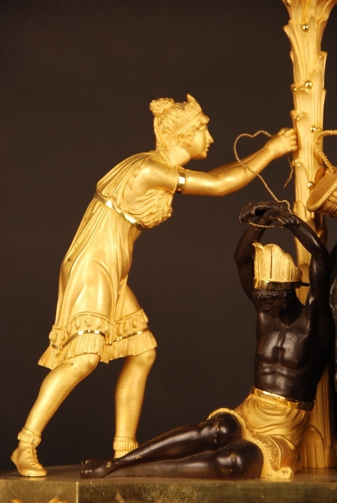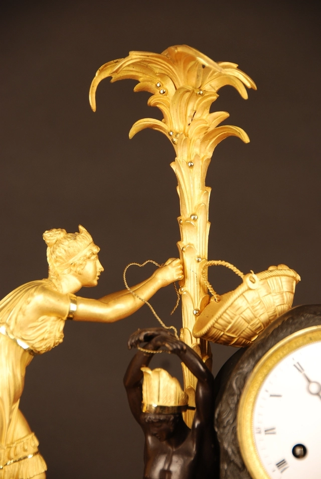 A very fine quality Empire gilt and patinated bronze figural clock depicting the celebrated model of Atala freeing Chactas, the white enamel dial signed à Paris with inner Roman numerals and outer Arabic numerals and a pair of blued steel hands for the hours and minutes. The movement with anchor escapement, silk thread suspension, striking on the hour and half hour, with outside count wheel. The magnificent case with dial drum surmounted by a basket and draped lion pelt supported on a log stack with a spear and gun propped against the right side and on the other the patinated bronze figure of Chactas dressed in a gilt loin cloth and feather headdress seated against a gilded palm tree which he is chained to but which the standing figure of the young Atala, wearing a tasselled robe and braided hair is trying to free him from. The clock and main figures upon an elongated octagonal plinth with central cast frieze showing Chactas carrying Atala in his arms preceded by a dog and followed by a missionary, the angled corners and ends cast with feathered motifs, on toupie feet