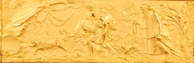 Chateaubriand’s tragic love story revolved around Chactas, a Natchez Indian and Atala, adoptive daughter of the Chief of the Muskogee. The Muskogee were fierce warriors and bitter enemies of the Natchez. During a tribal dispute Chactas was captured, he was tied to a tree but before he was sacrificed Atala came to his rescue. This part of the story is illustrated in the sculptural case above, with the hunters’ weapons beside the clock and his fate, the burning fire surrounding the dial. Once freed Chactas and Atala travelled around North America setting up home with a hermit missionary named Father Aubry. Strongly influenced by the latter and by Atala’s faith, Chactas also converted to Christianity. Atala and Chactas fell in love and though he asked her to marry him she was torn between her heart’s desire and filial love since she had once promised her mother that she would dedicate her life to the service of the Church. So rather than live without consummating her love, Atala took poison; Chactas found her dying in a cave whereupon Atala explained why she could not marry him. “To save my life [at birth] my mother made a vow: she promised the Queen of the Angels that to her, if I escaped death, should be consecrated my virginity….Fatal vow which hurries me to the grave!”. The narrative is then continued on the plaque below; after Atala died, Chactas and the missionary took her out of the cave to be buried and as they did a dog appeared.