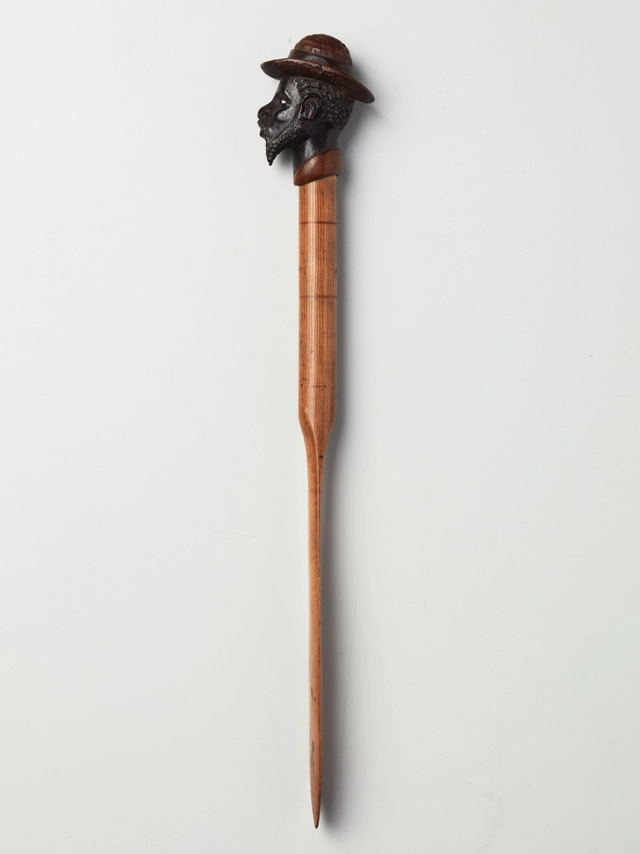 A multicoloured carved sculpture of a hunchback with remarkable buttons on his jacket, circa 1850
