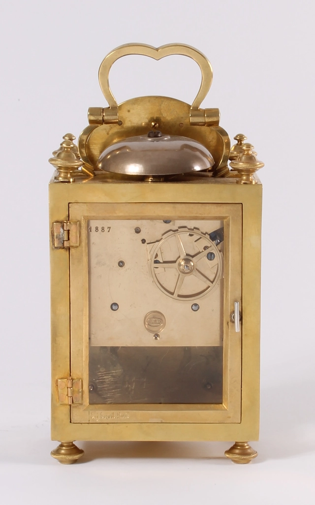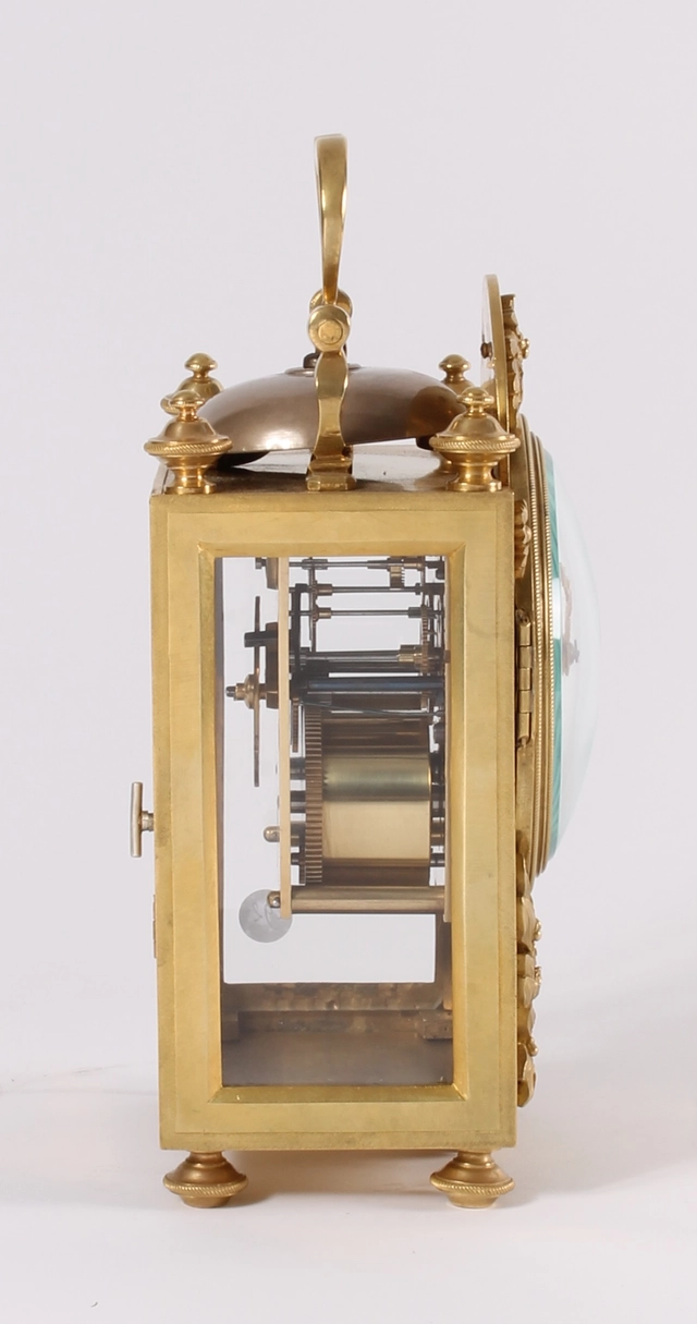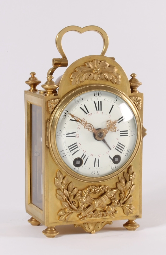 An attractive French miniature brass table lantern alarm timepiece, circa 1780