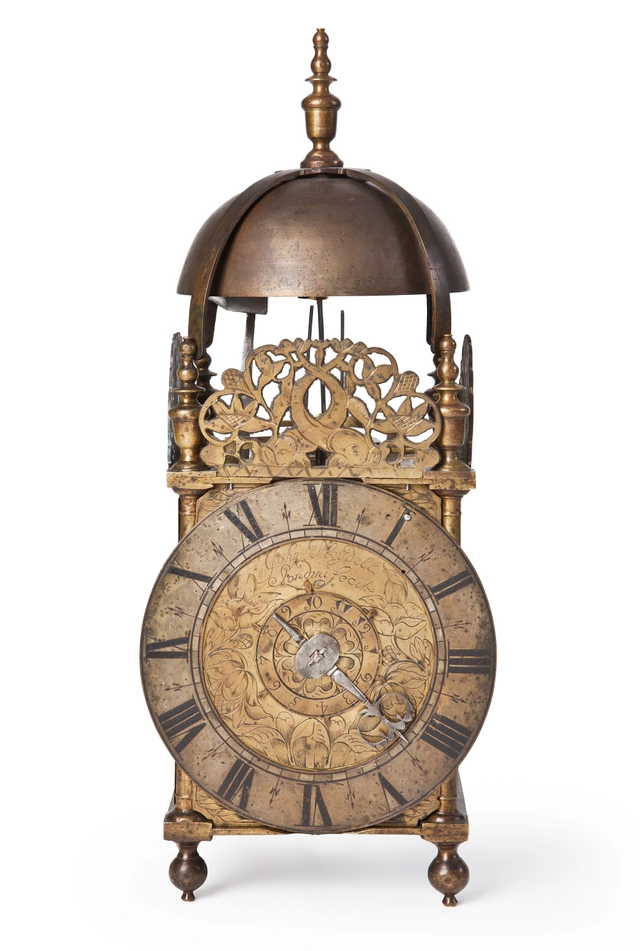 A good English brass striking and alarm 'wings' lantern clock, circa 1680
