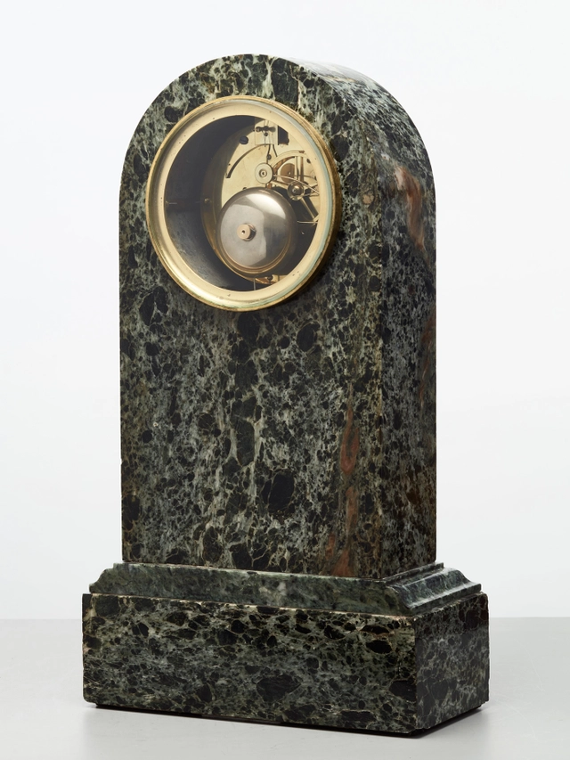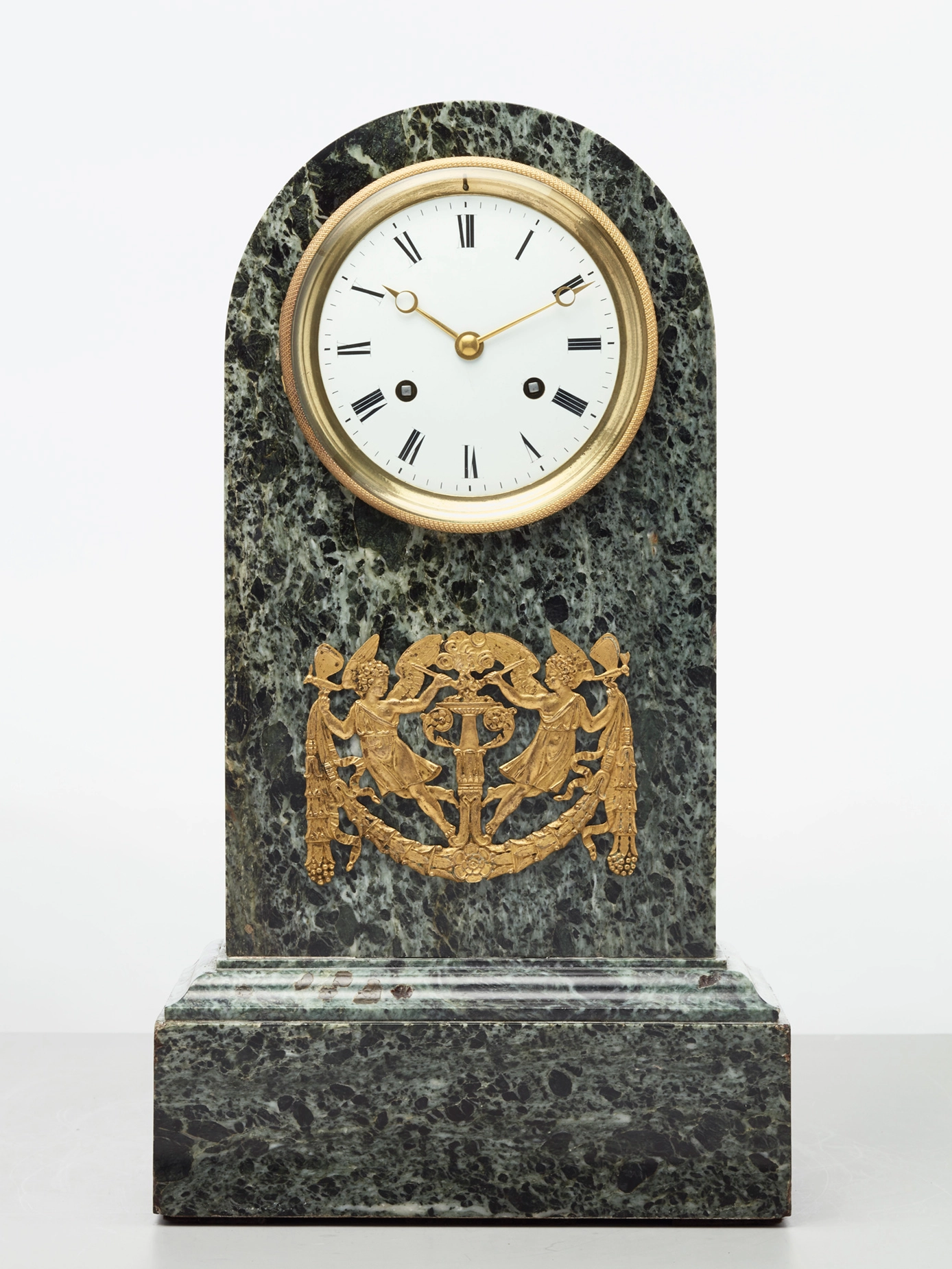 A rare French ‘Directoire’ marble and ormolu mounted ‘au bon Sauvage’ mantel clock, circa 1800