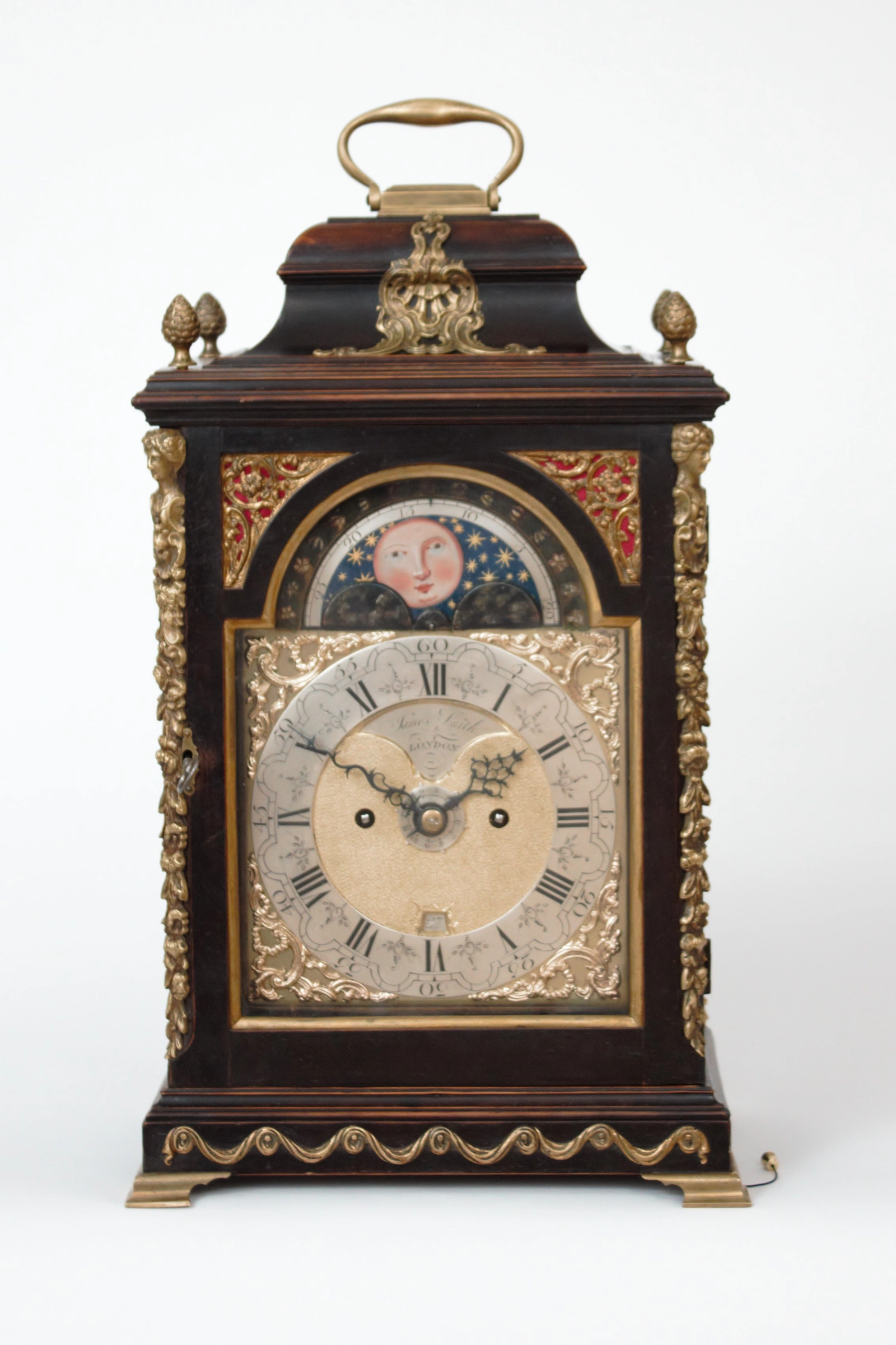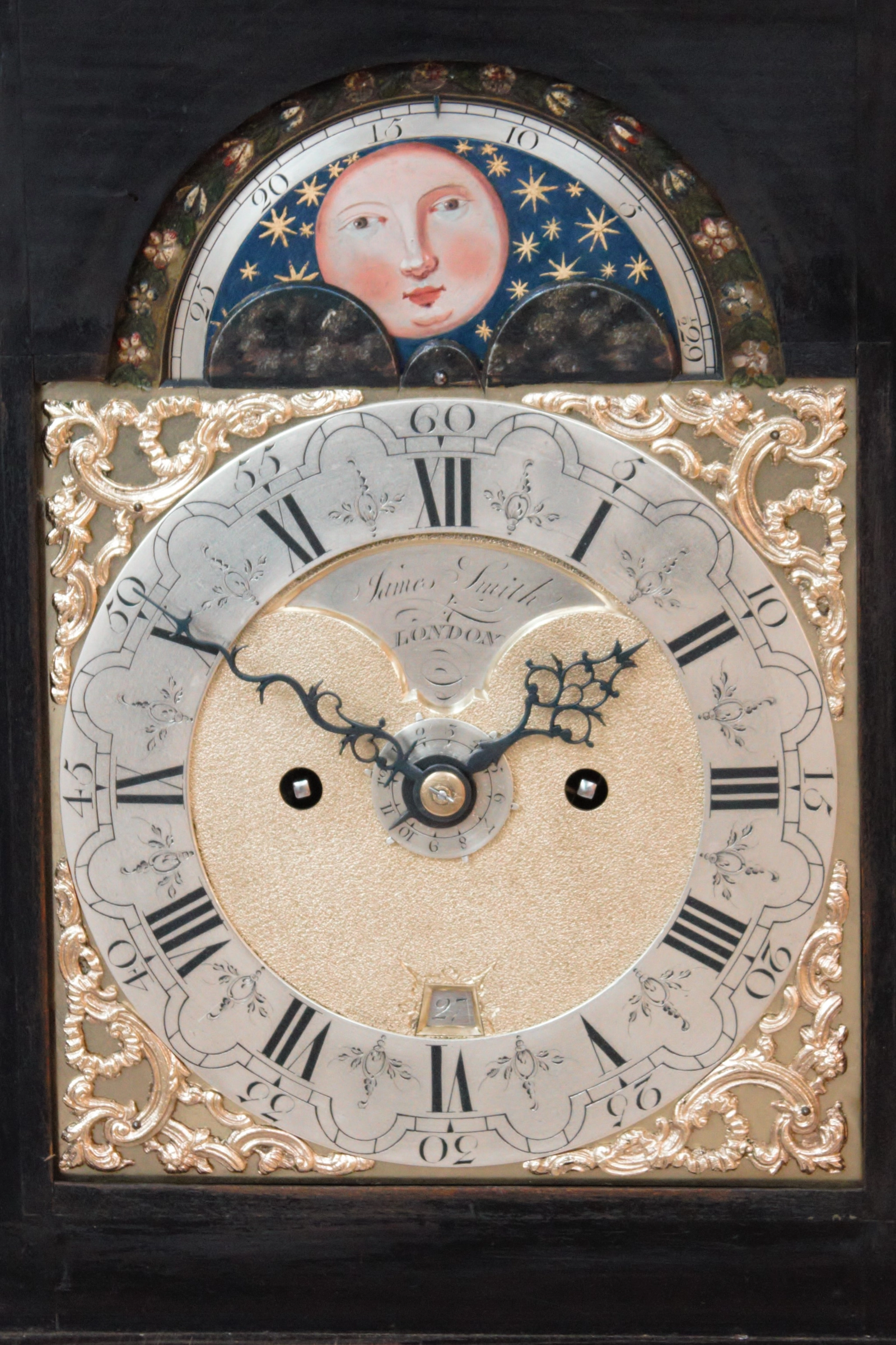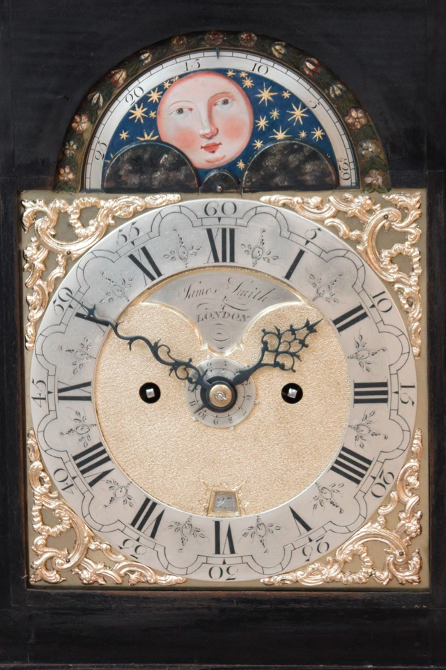 The 17.5-cm arched brass dial has a silvered and engraved chapter ring with Roman numerals and five-minute arches. In the matted brass centre is the date aperture and a recessed silvered signature plaque signed James Smith London. Around the chapter ring there are four pierced brass rococo spandrels. In the with polychrome flowers adorned arch is the moonphase with date of the moon cycle. The pierced and foliate shaped hands are made of blued steel, the alarm disc of silvered brass.