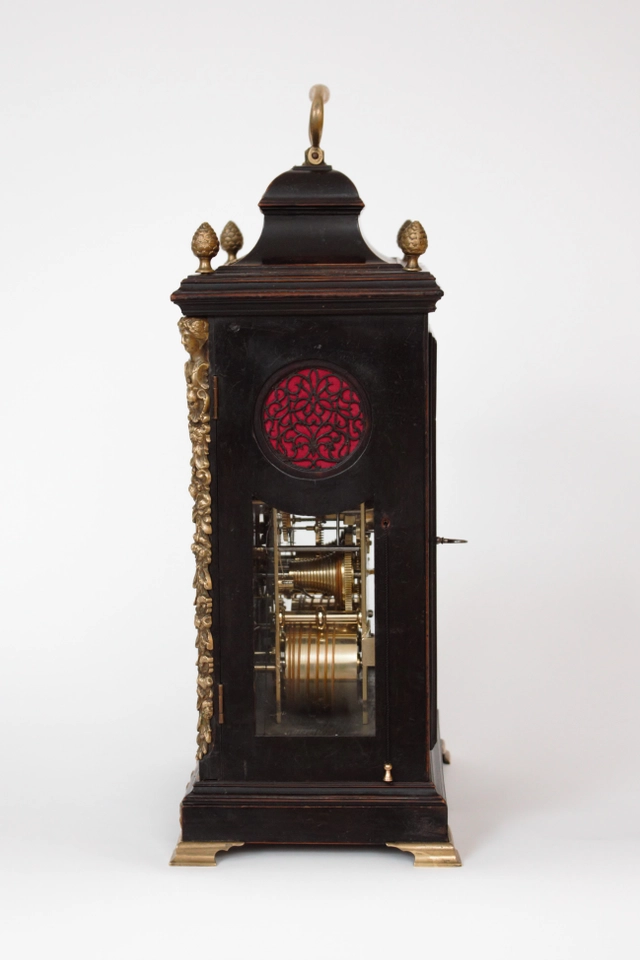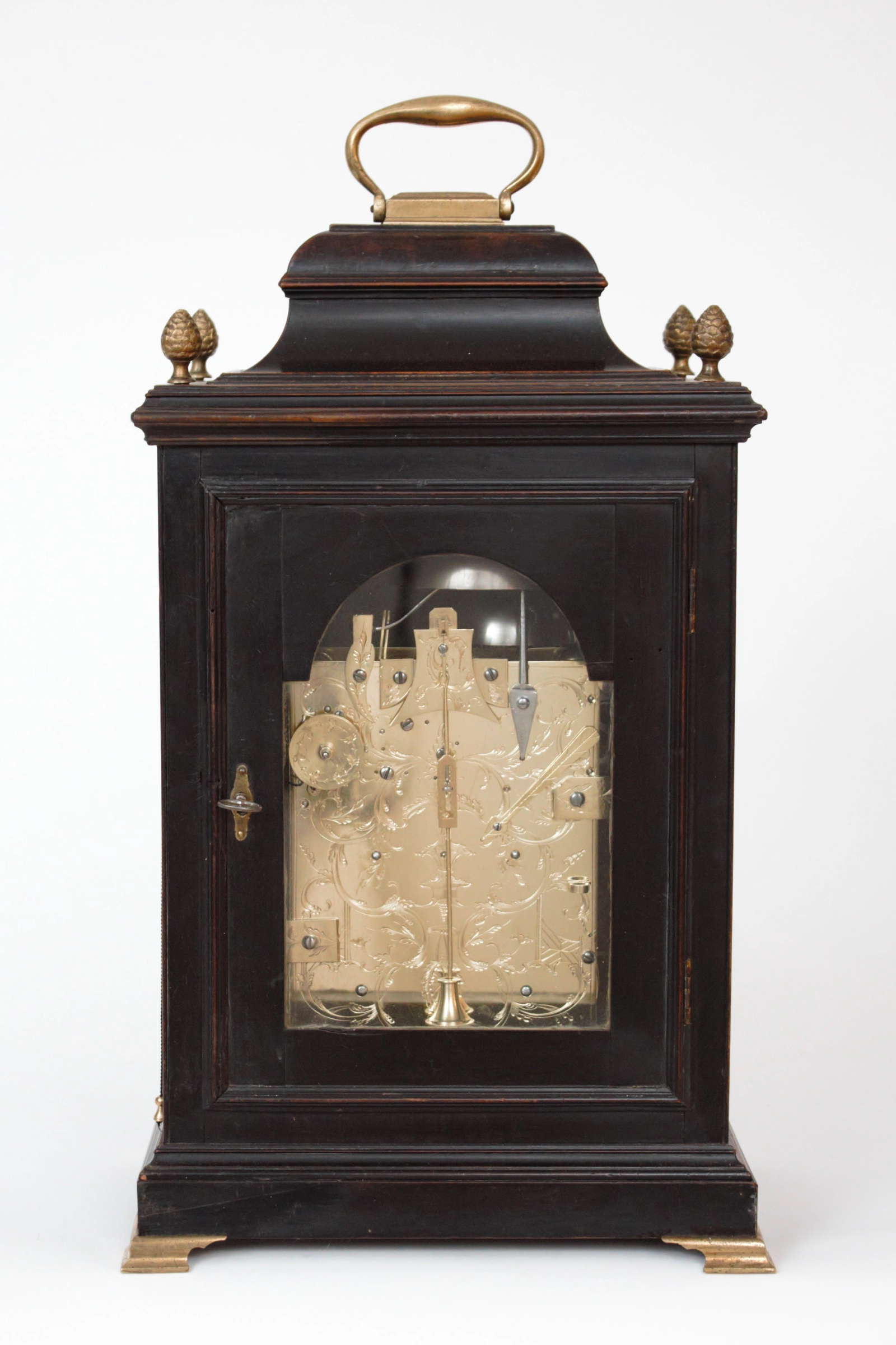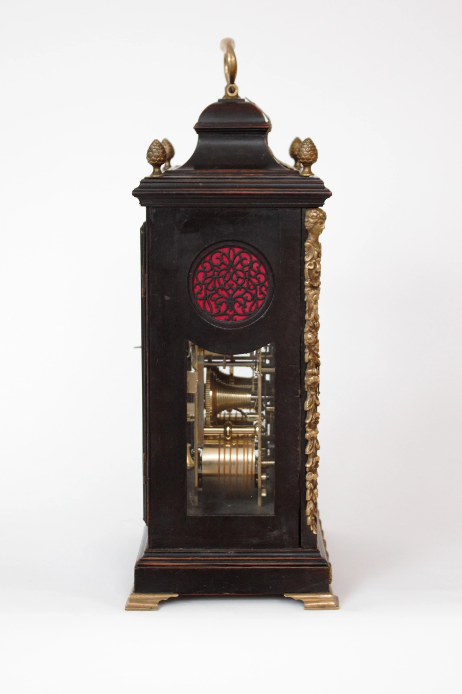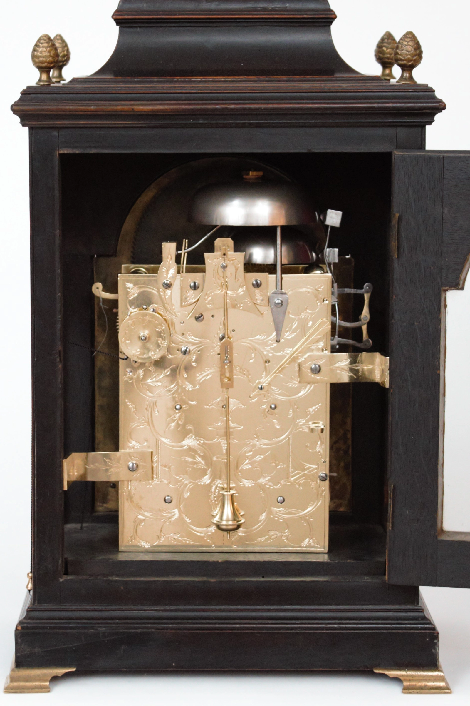 The ebonised case has a true bell top surmounted by a handle and rococo ornament. There are four berry finials on the moulded corners. There are pierced brass spandrels in the upper corners of the glazed front doors with herm and trailing flower corners.