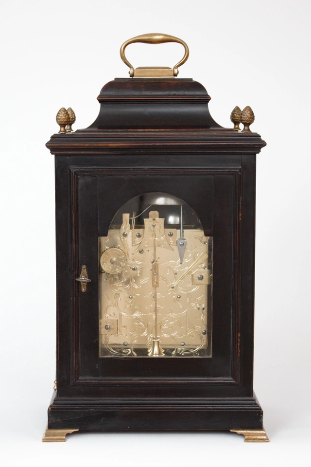 The movement is driven by two spring barrels with fusees and has a duration of eight days. It is being regulated by verge escapement in combination with a short pendulum. The clock has Dutch half hour rack striking on two alternating bells with repeating on demand. It has a pull wind alarm on the large bell. The back plate has fine foliate engraving.