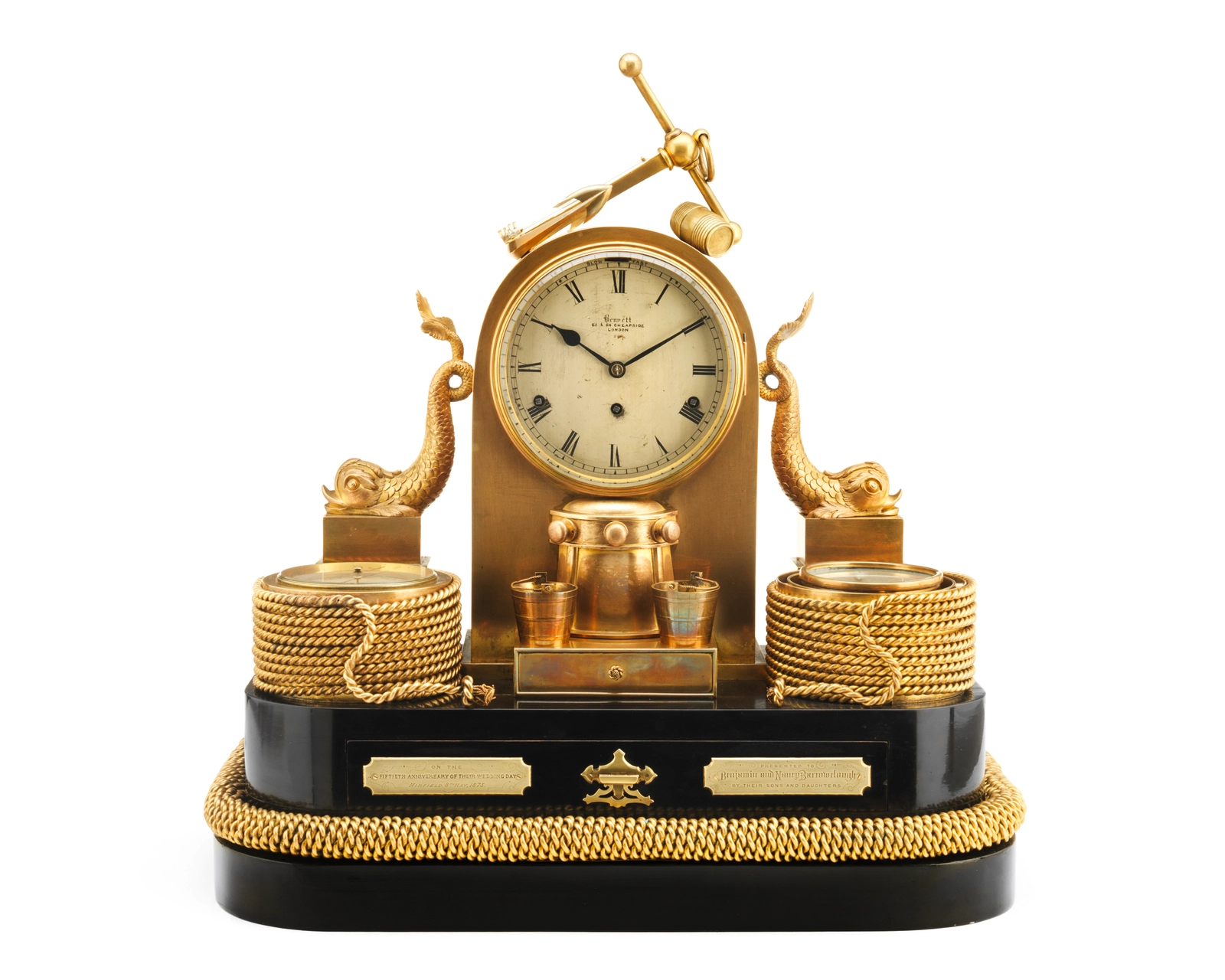 The extremely substantial case measuring 62cms (24.5ins) high by 60cms (24ins) wide, surmounted by an Admiralty Pattern anchor with applied ivory thermometer to the shank, the case flanked to each side with an addorsed dolphin on a plinth containing a drawer with imitation knotted rope handle, in front of a coil of rope, each coil holding an instrument; to the left an aneroid barometer with signed silvered dial; to the right a 'Singer's Patent compass, the centre portion with a pair of buckets and capstan over a key drawer, the large ebonised base set with a sectioned drawer and applied to the front with a pair of presentation plaques reading