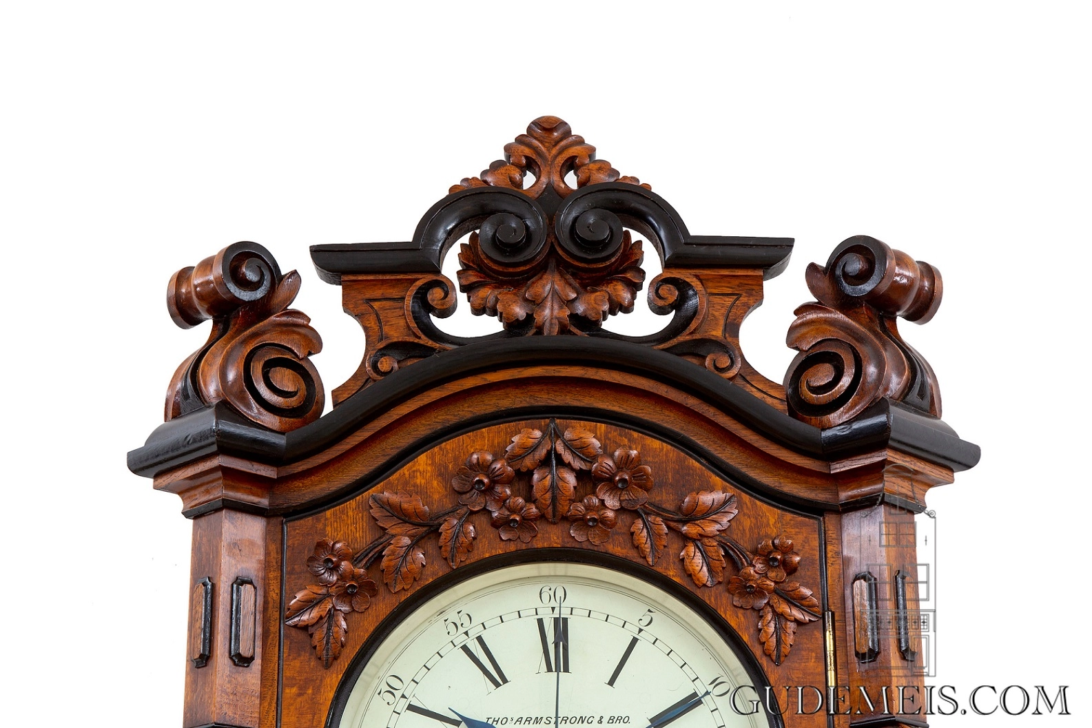 The 28.5-cm Japanned dial has Roman chapters and Arabic numerals for the five minute indication. The centre is signed Tho Armstrong & Bro Manchester. The spade hands and counter weighted sweep seconds are made of blued steel.