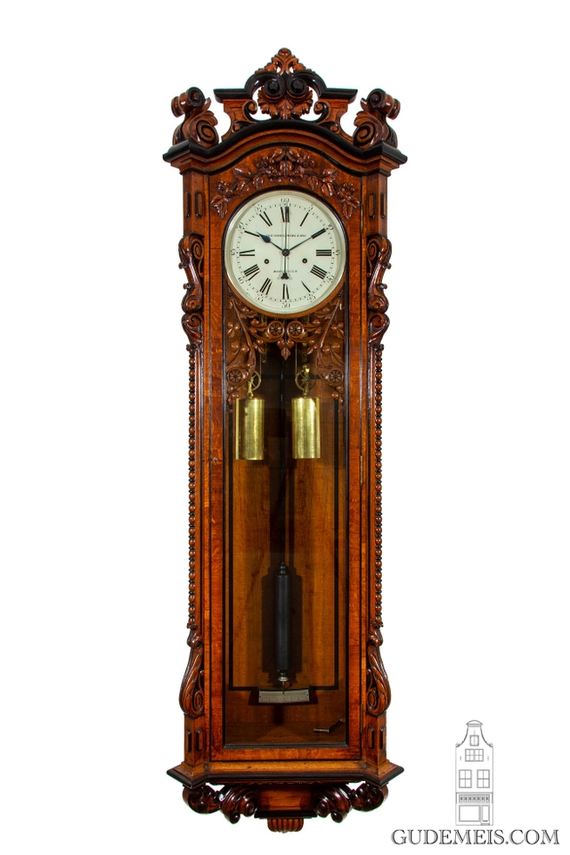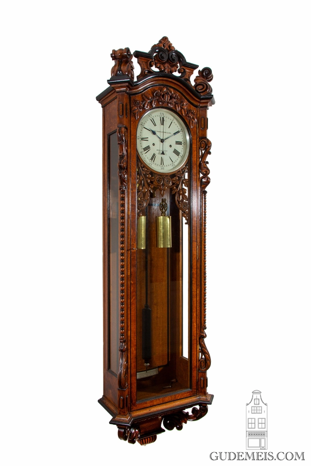 The well built brass movement is driven by two weights and has a duration of a week. It is mounted on two brass ‘gothic’ brackets mounted on the back board. The going train has Graham escapement and Harrison’s maintaining power. The pendulum with black lacquered wood rod and zinc bob is separately roller suspended from the back board of the case. The movement has half hour striking on a gong by means of rack striking. It is quite unusual for an English clock to strike the half hours with a single strike.