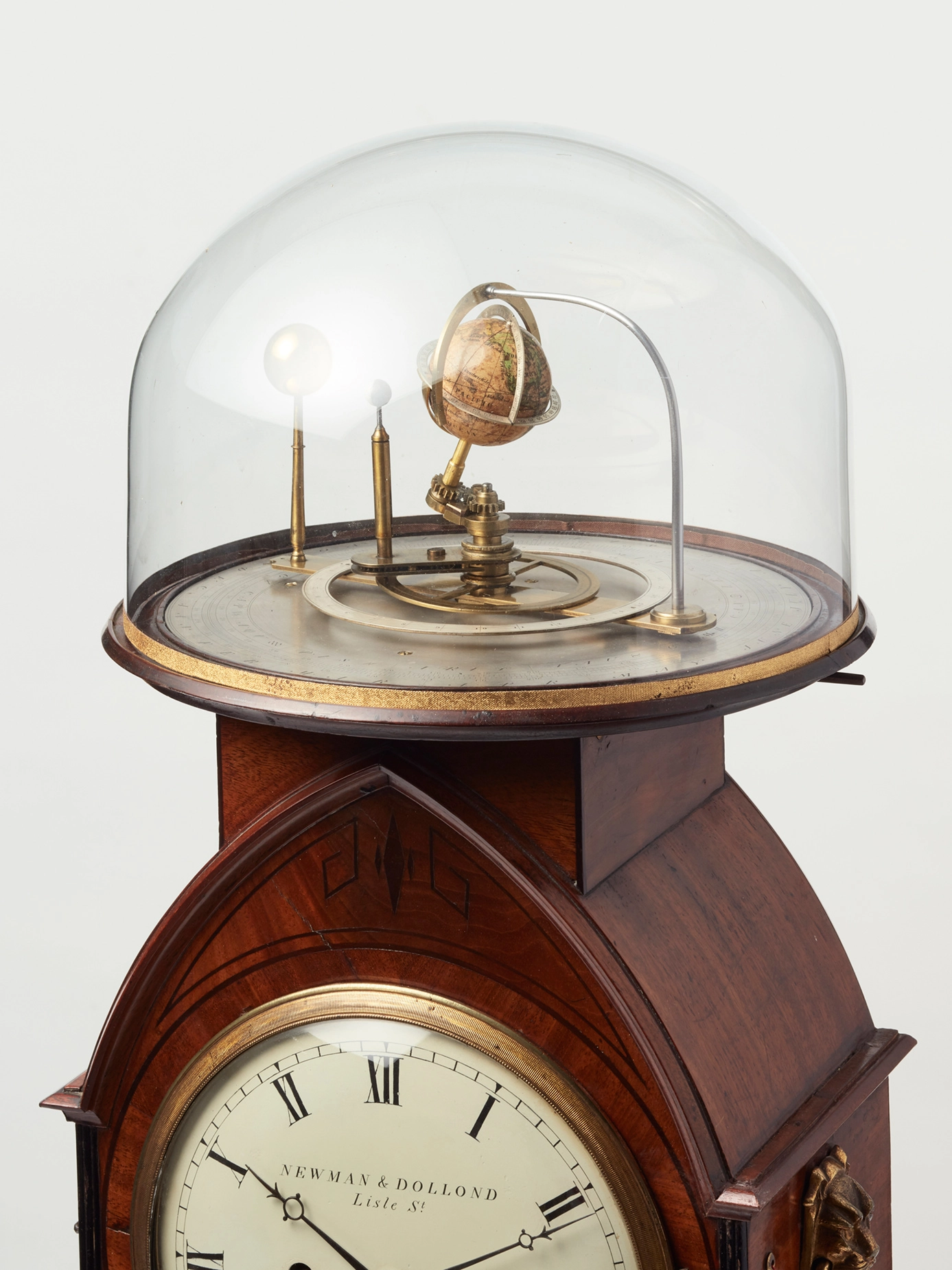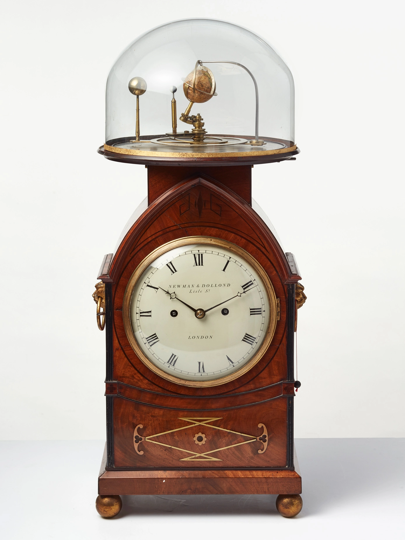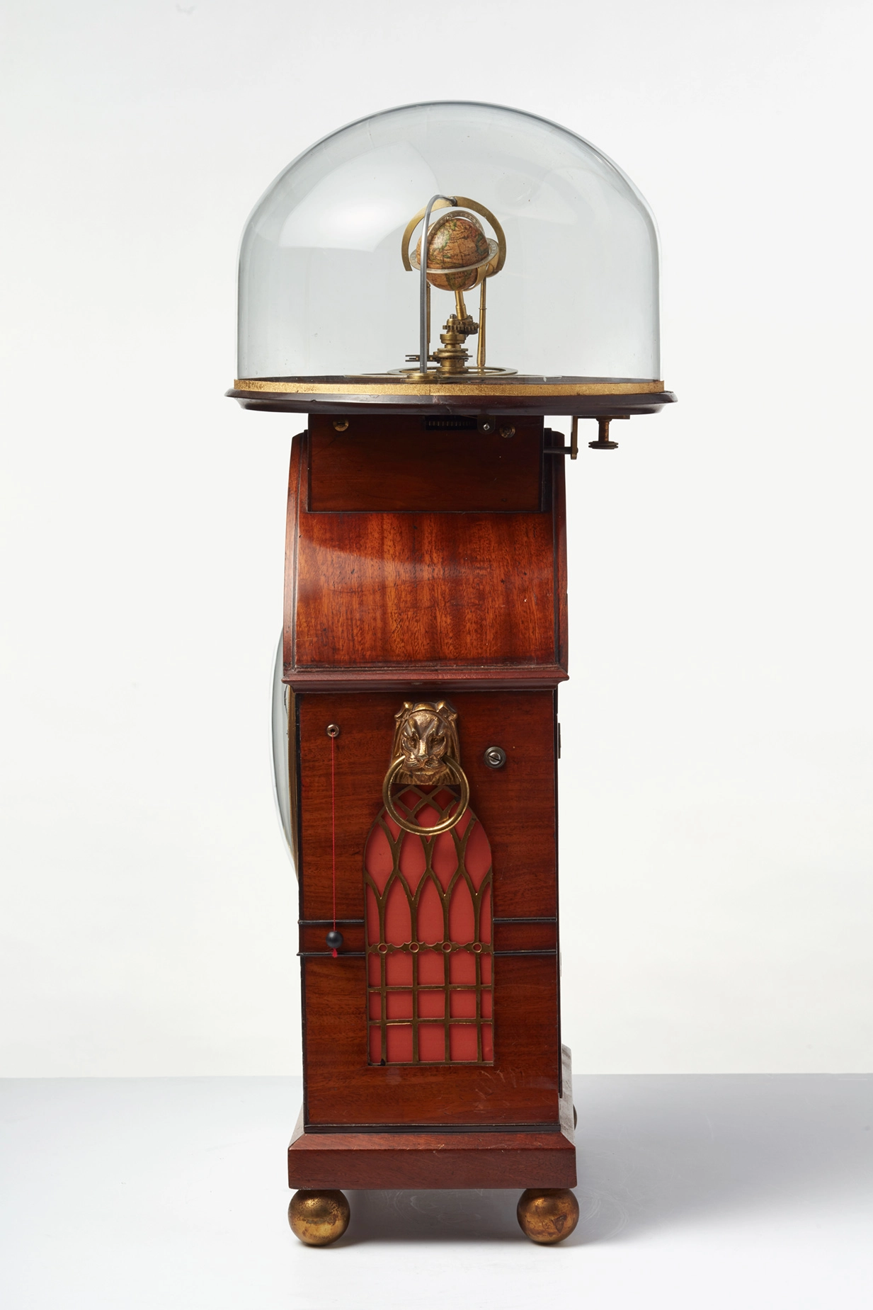 The beautiful Regency mahogany brass inlaid case on ball feet and on top the orrery connected to the movement. On the side, two bronze cast lion heads to handle the clock. On the right hand side, a pull repeat option.