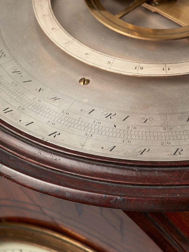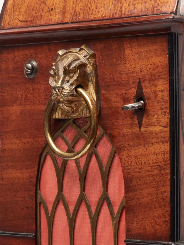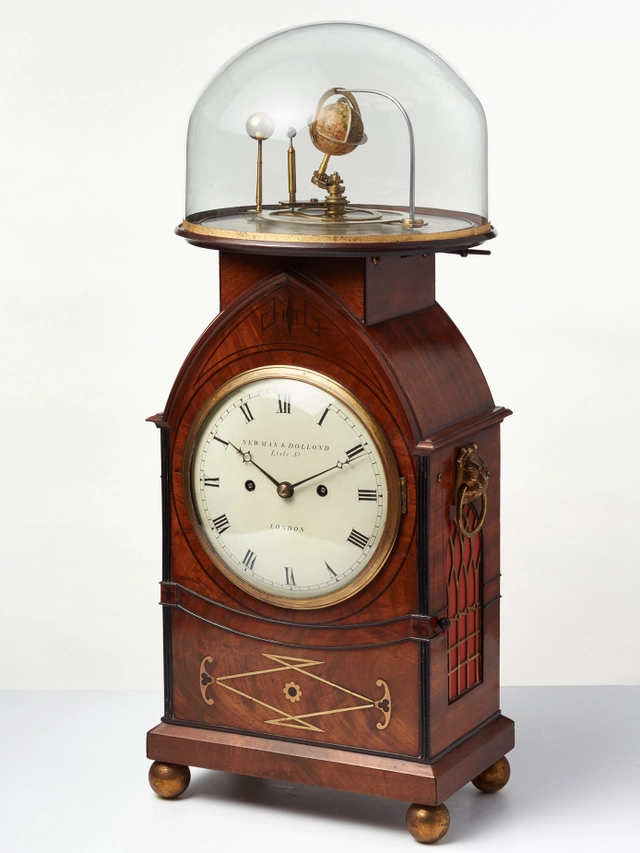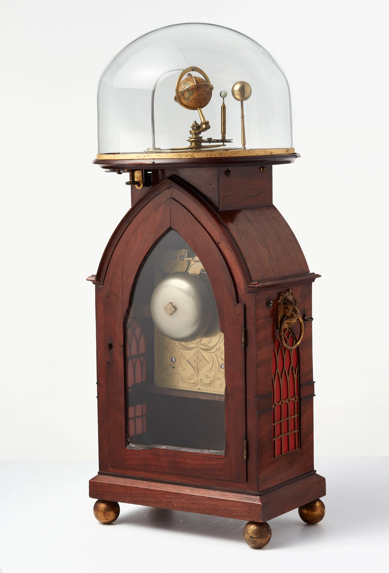 The beautiful Regency mahogany brass inlaid case on ball feet and on top the orrery connected to the movement. On the side, two bronze cast lion heads to handle the clock. On the right hand side, a pull repeat option.