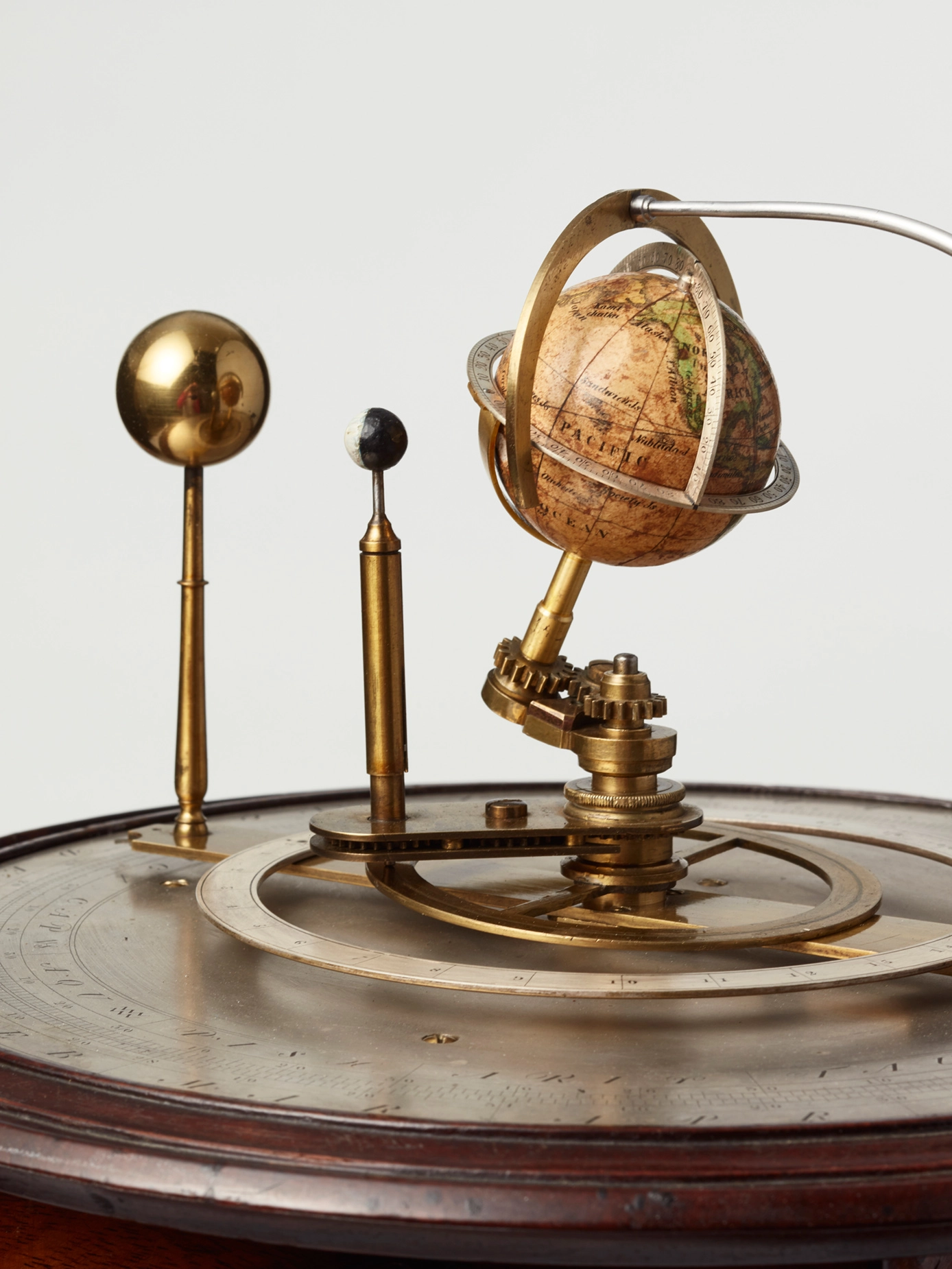 The orrery on top has lovely engraved silvered dials and rings indicating the position of the earth, moon and sun. A beautiful nineteenth century miniature rotating globe. The height of the clock and orrery is 65cm.