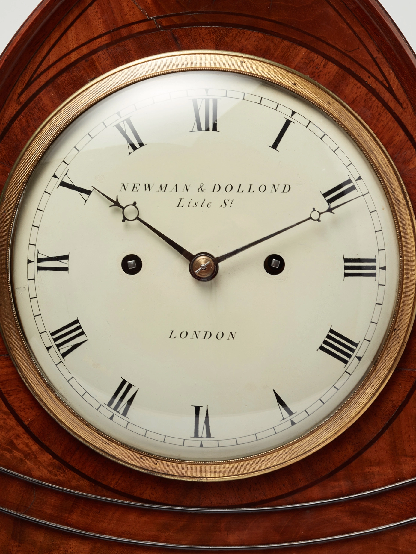 The white painted dial with Roman numbers, bearing the name Newman & Dolland, Lisle Street, London. On the backside of the dial, an engraving with the signature of Newman & Dolland. Steel hands.