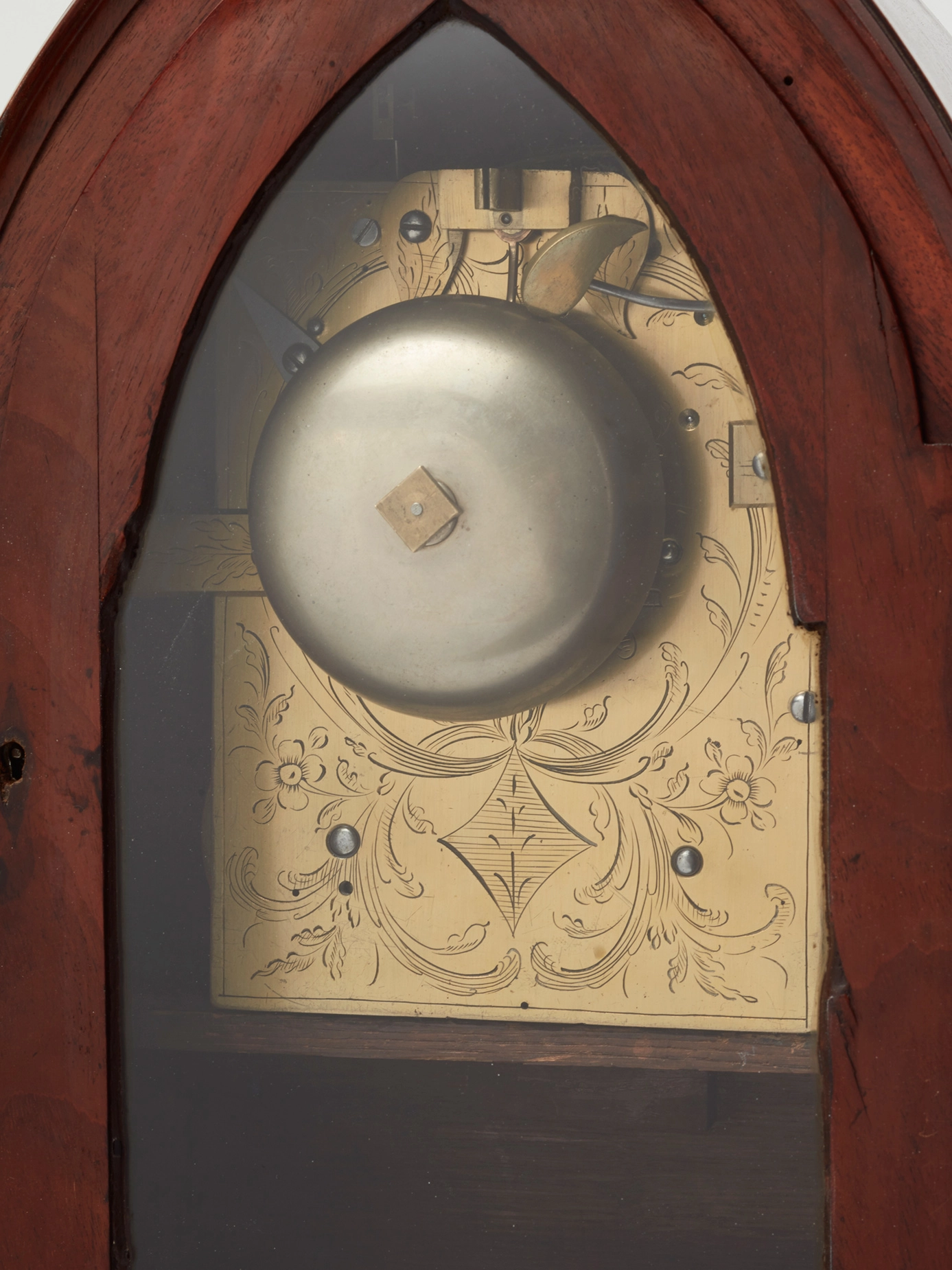 The eight day ‘on-bell’ striking movement with anchor escapement. Nicely engraved backplate.