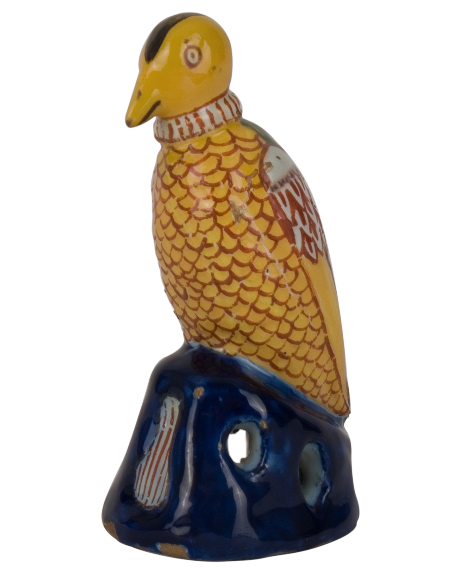 Models of birds of this kind were produced in quite large numbers by Chinese potters during the Kangxi-period. These bird found great appreciation among the Delft potters, who began to imitate them.