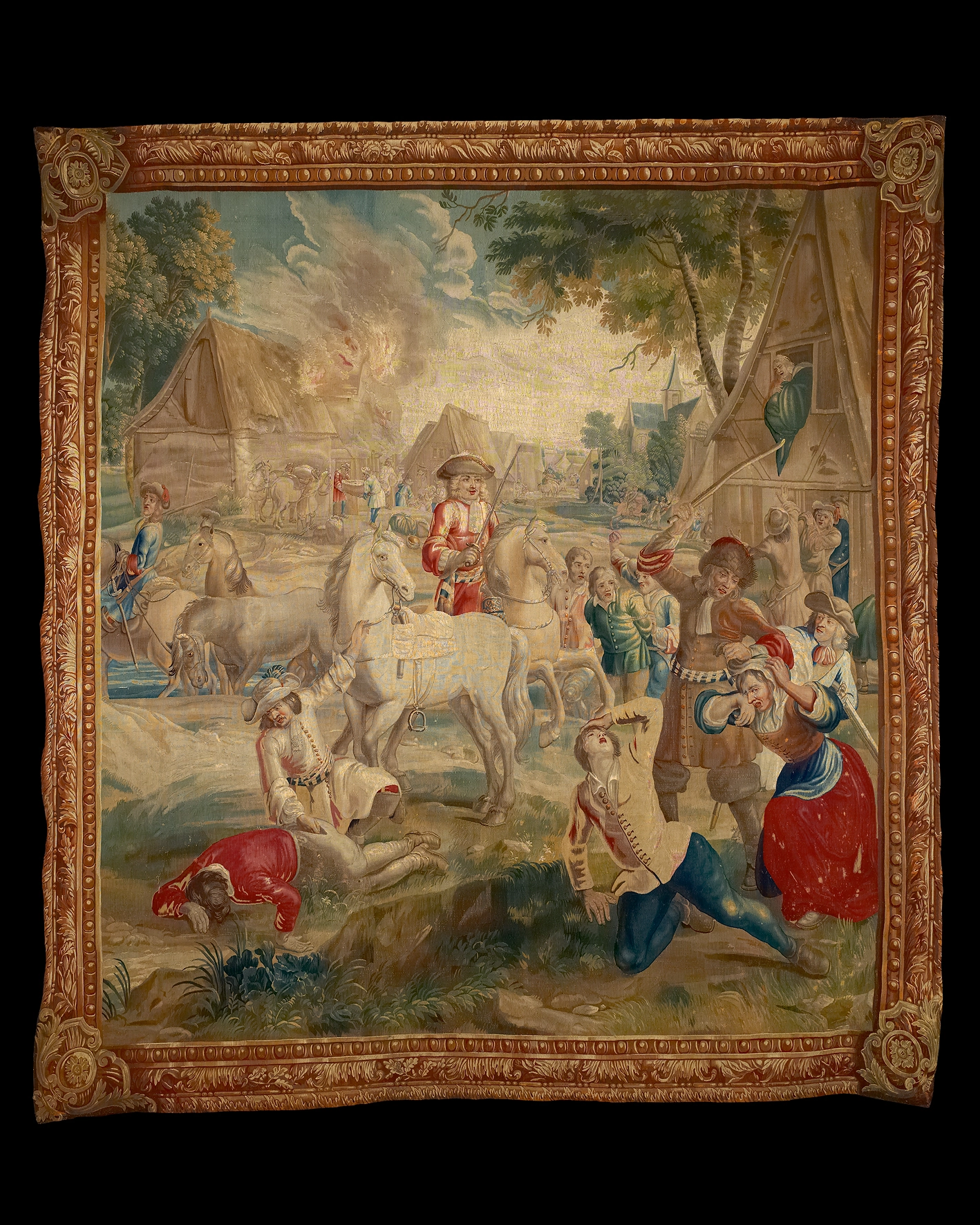 In the workshop of Jérome le Clerc and Jacques van der Bocht I this tapesty was woven after a design of Ignace de Hondt. It’s the fourth tapestry in a series of eight. The ‘editio princeps’ of this series was commissioned by Elector Maximilan Emmanuel of Bavaria (viceroy to the southern Netherlands) in 1696. The Elector had the wall hangings manufactured to commemorate his succesfull battle with the Turks. Tapestries like these, that depict contemporary historic events, are very rare, not in the least because they were without exception especially commissioned. This explains why there are so few similar series. Copies of these series; ‘les Arts de le Guerre’ were commissioned by Stadtholder-King William III (William & Mary), margrave Ludwig von Baden and the first duke of Marlborough. One of the tapestries from this last series is still to be seen at Blenheim.