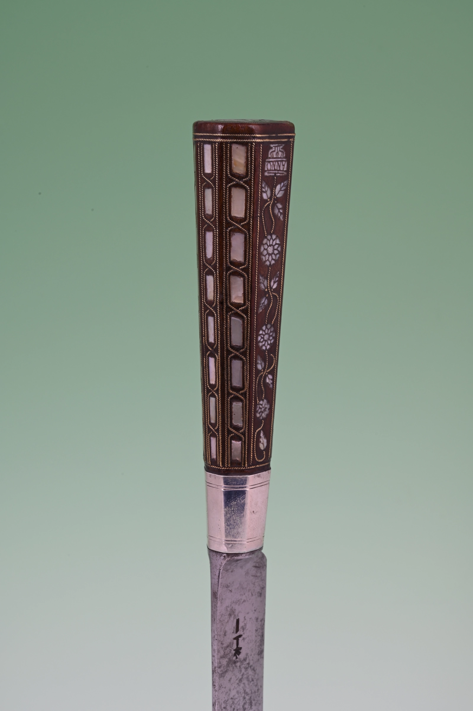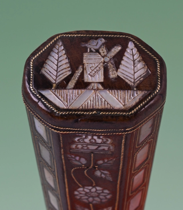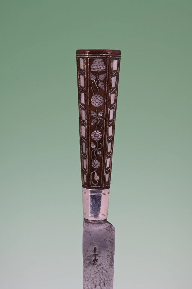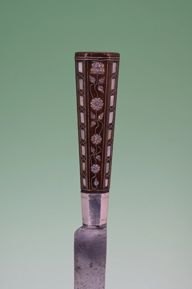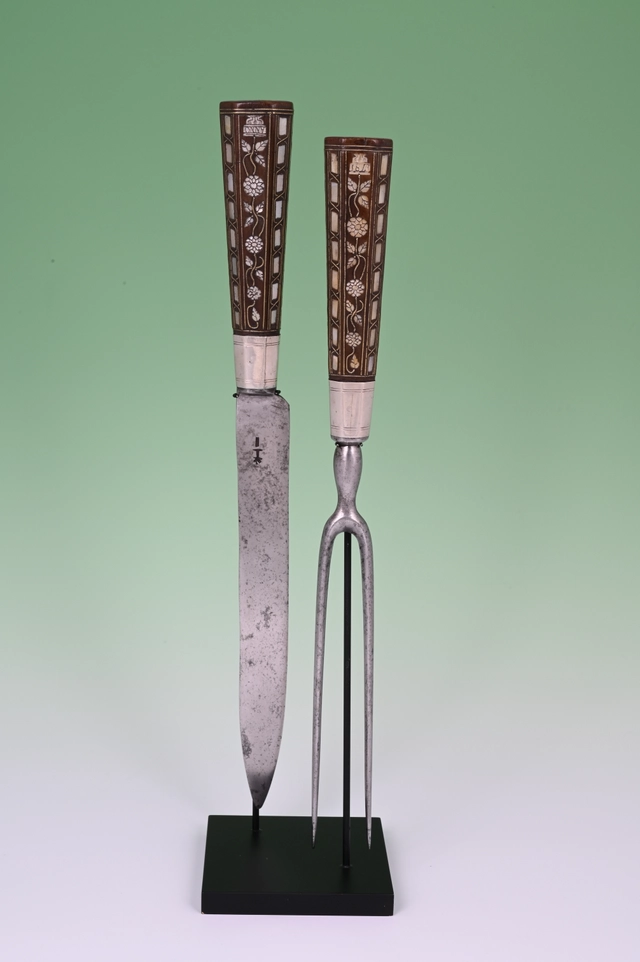 This carving knife and fork is inlaid with engraved mother-of-pearl and twined brass wire.