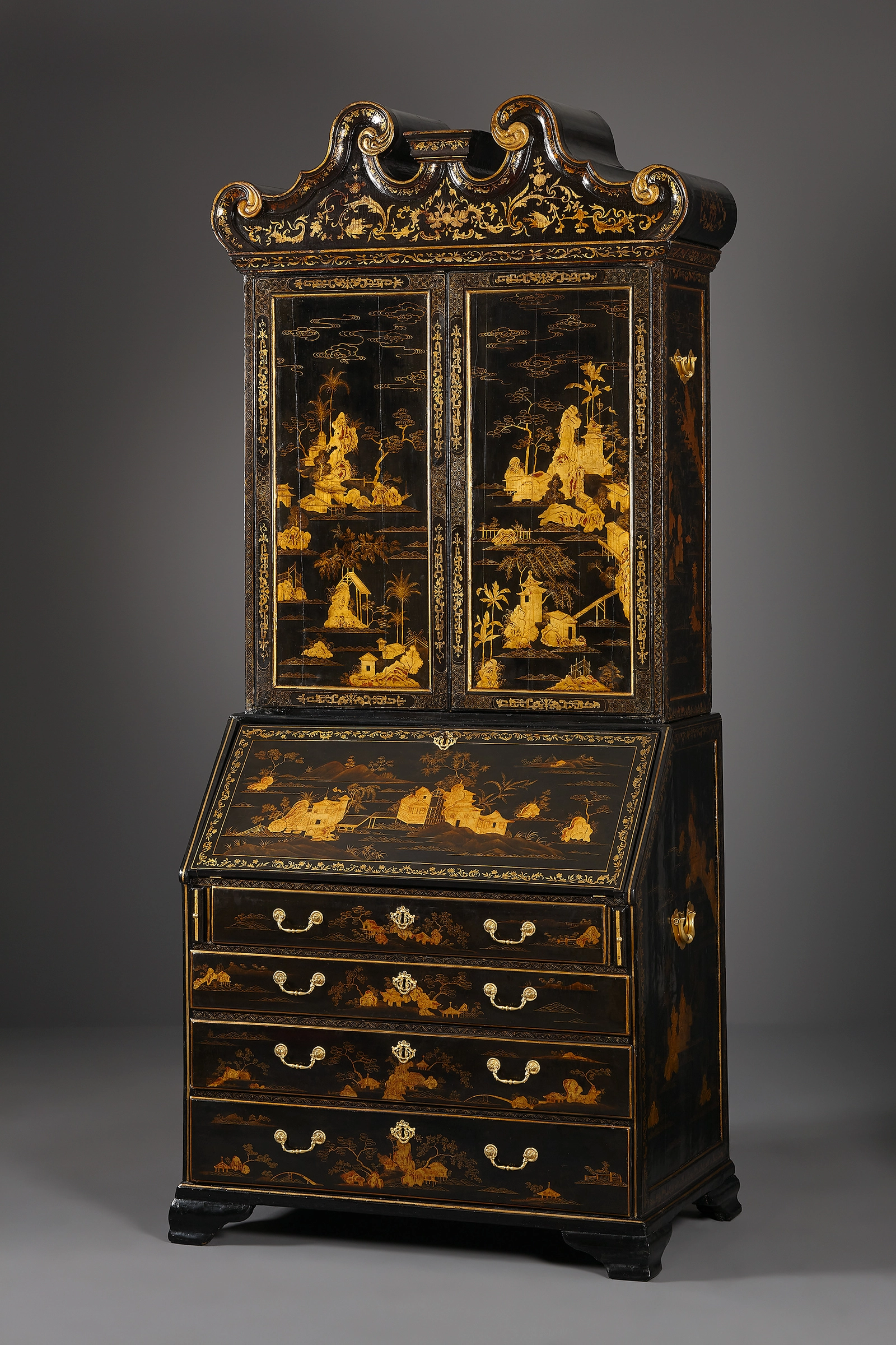 A Chinese lacquerwork bureau with upper cabinet section, evidently modelled after an English bureau cabinet with identical shape and dimensions dating from approximately 1735-1745. The bureau stands upon a rectangular base, with four lightly curved feet, and incorporates four wide drawers. Above this is the slanted lid, which folds down to form a writing surface, thereby also granting access to the interior, which features recessed drawers and compartments. The upper section takes the form of a straight cabinet with two doors, behind which is a motley interior of multifarious doors, compartments, slides and grilles that visually reference Chinese architecture. The crown is a Chinese interpretation of the English swan neck pediment.