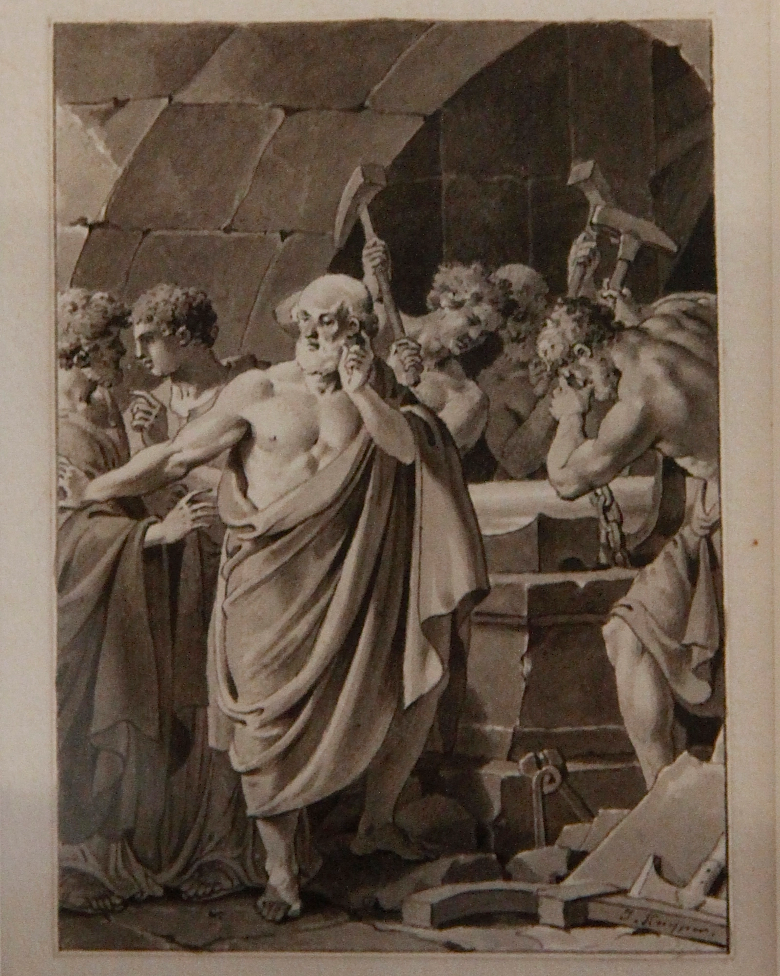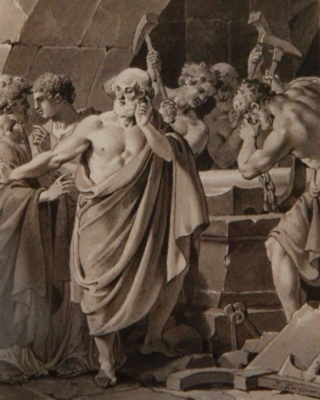 Kuyper got his training in Amsterdam, first at the municipal drawing academy and later at the Royal Academy; he was a pupil of Jurriaan Andriessen. As a painter and designer for prints he is an important representative of Neoclassicism in Holland. Kuyper made several drawings of Felix Meritis (famous drawing academy and arts centre in Amsterdam), where he was active as a graphic designer. His drawing of Raadpensionaris Rutger Jan Schimmelpenninck is in the Britsh Museum. Kuyper made several preliminary drawings for prints in Martinus Stuart's 'Roman histories, Amsterdam, published between 1794 and 1810, and A. Fokke Simonsz.'s ‘Ernst en boert voor de XIXe eeuw, of Almanach van beschaafde kundigheeden’. The latter almanac was published in Amsterdam from 1801 to 1803 and reprinted (with new calendars) from 1805 to 1807. Seen the size and subject, our drawing was made as a design for a book illustration. This drawing of Pythagoras is a study for the print in the Almanac of 1802. Dimensions: 6,7 x 9,5 cm (with frame: 32,5 x 37,5 cm).