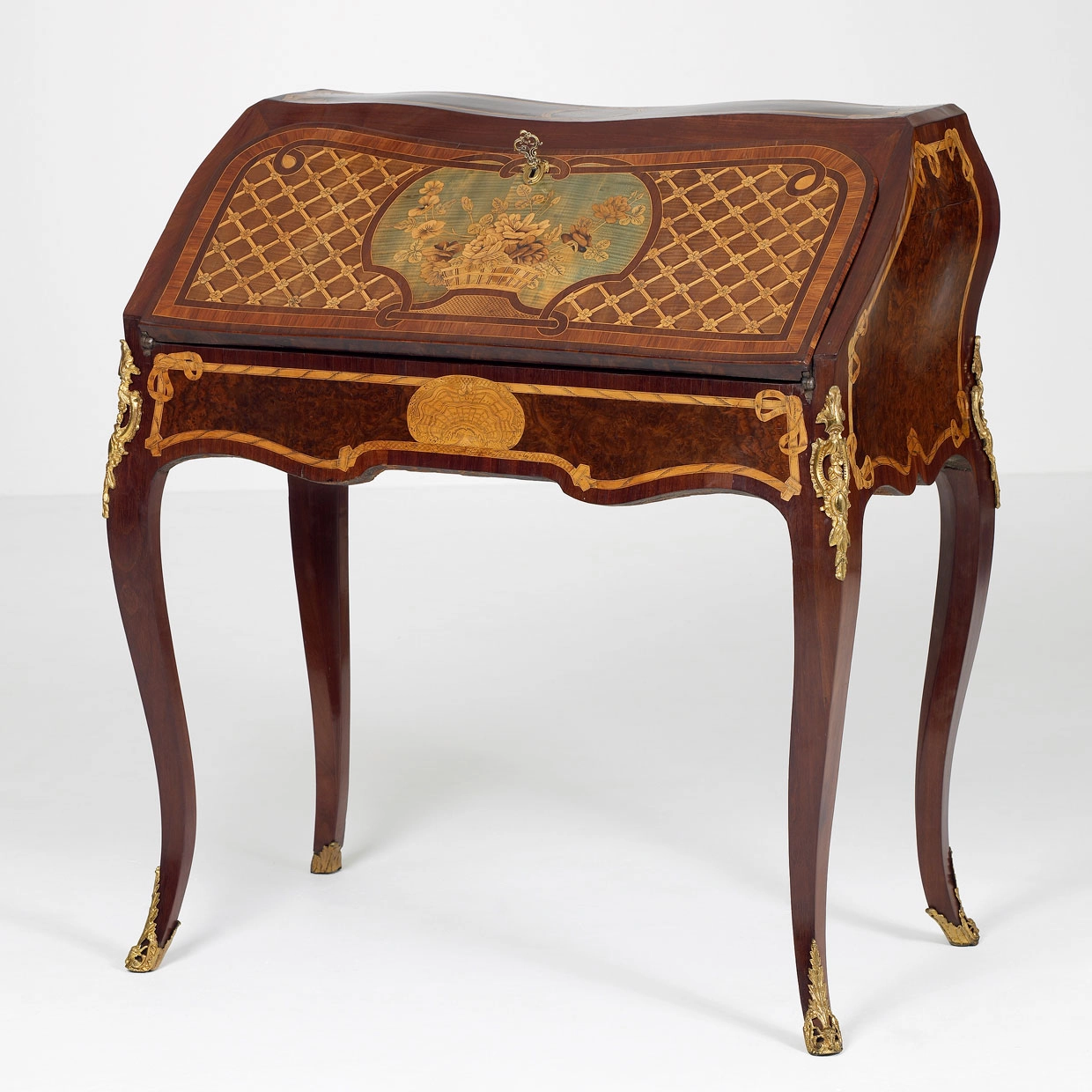 The writing desk rests on elegant doubly curved legs and has bulging sides and a bulged back. The front, the top that can be folded out, the sides and the drawers are decorated with marquetry. On the top of the desk there’s a cartouche with the initials ‘HGL’ surroundes by a ribbon and bow. The corner fittings and sabots are in Rococo style, the scutcheon with garland decoration is from a slightly more recent date.