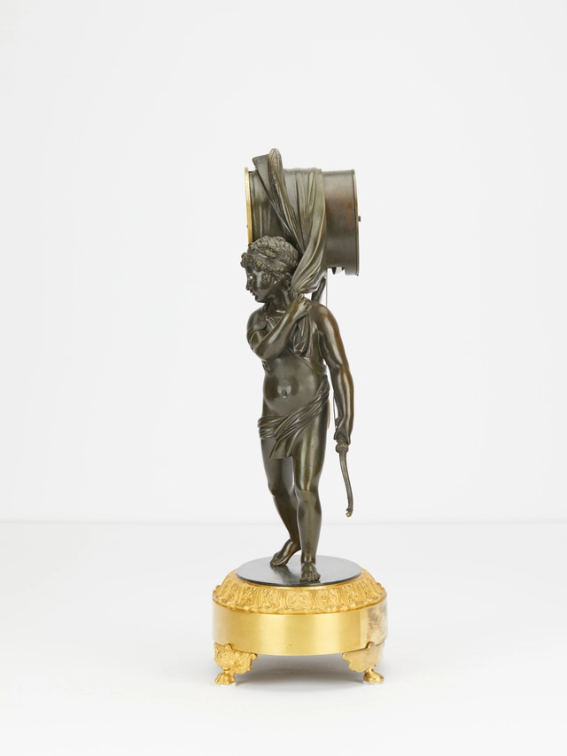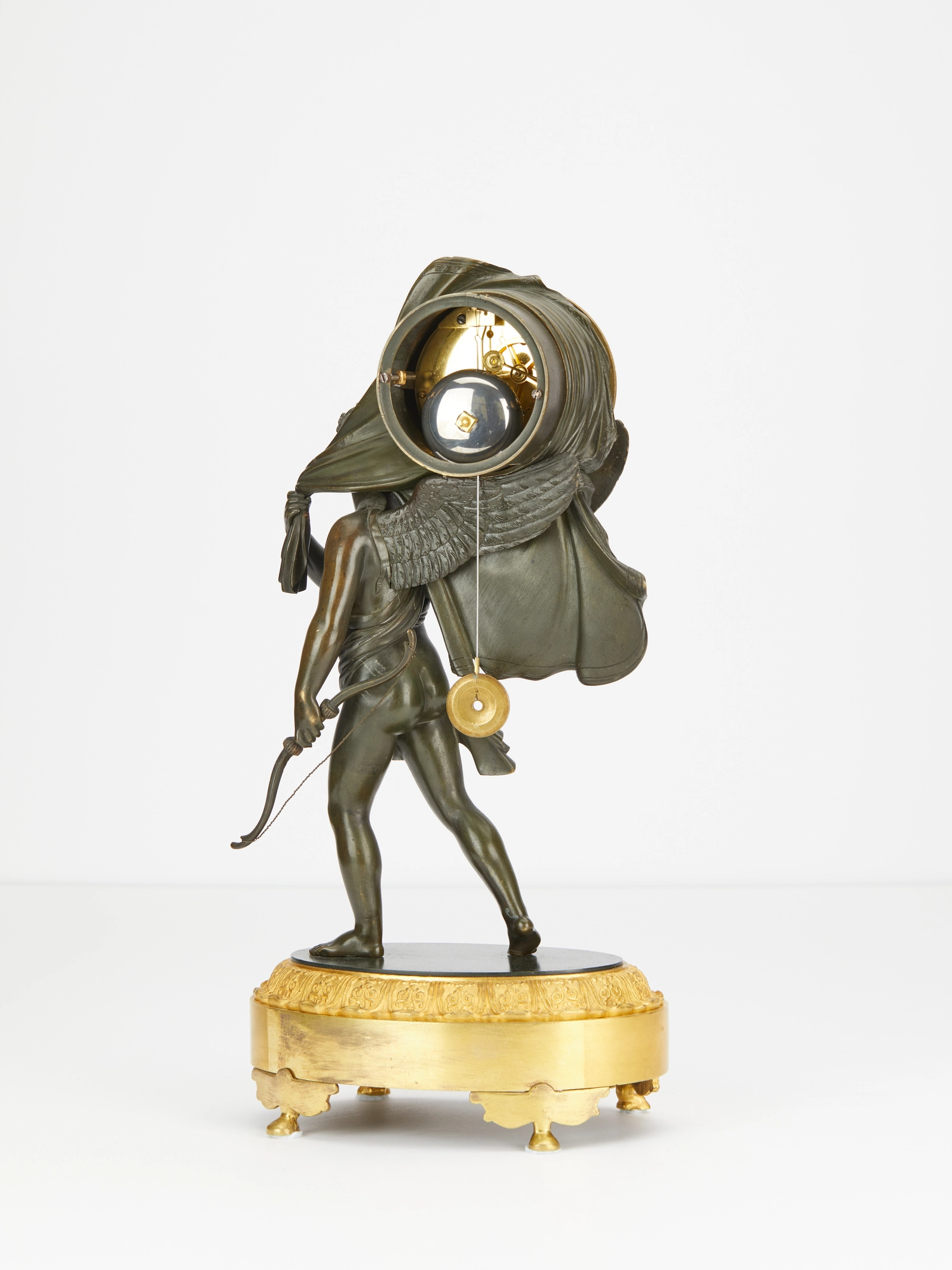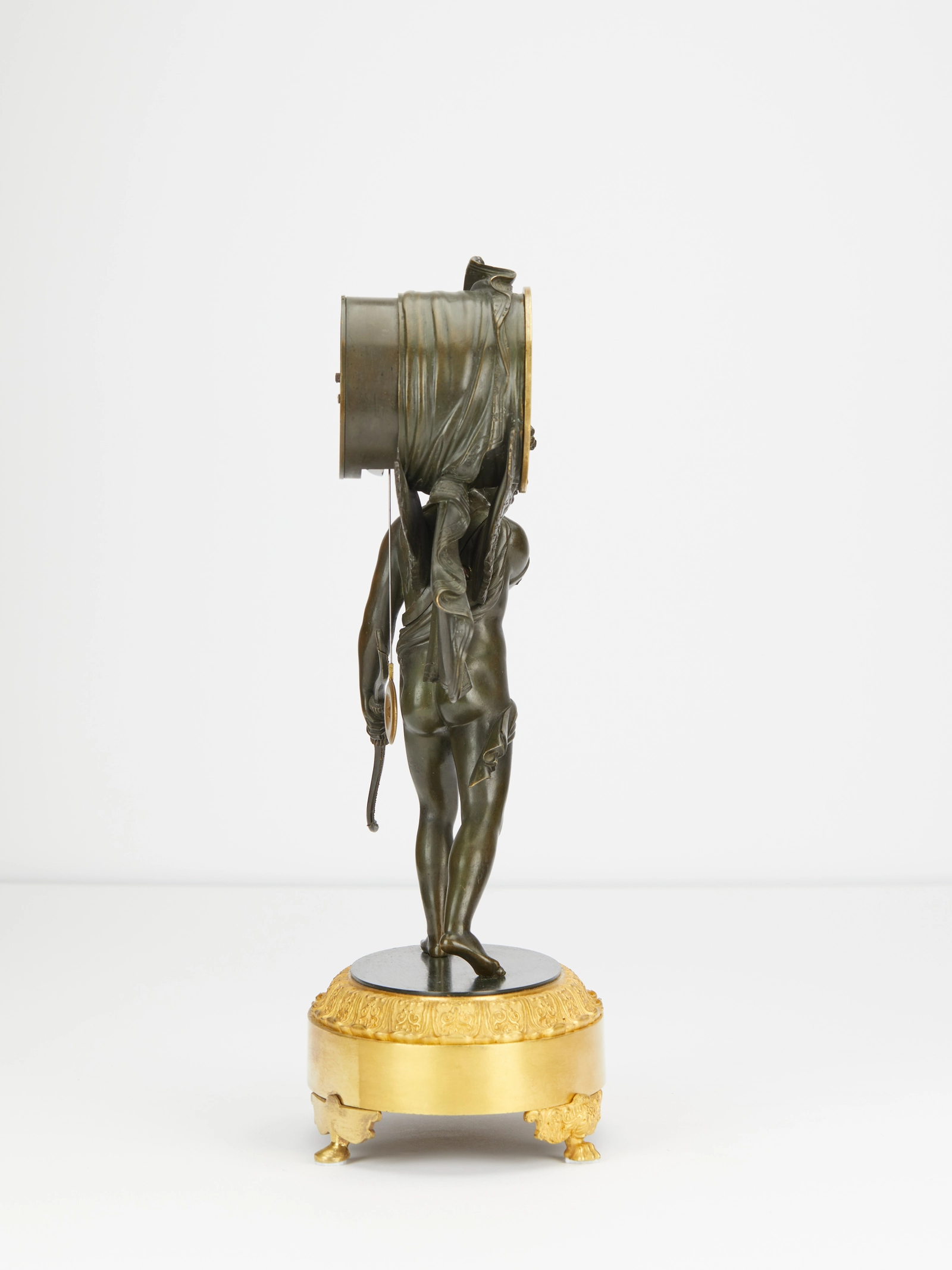 A small French Empire patinated and ormolu sculptural mantel clock Grandperrin à Perrin circa 1805.
