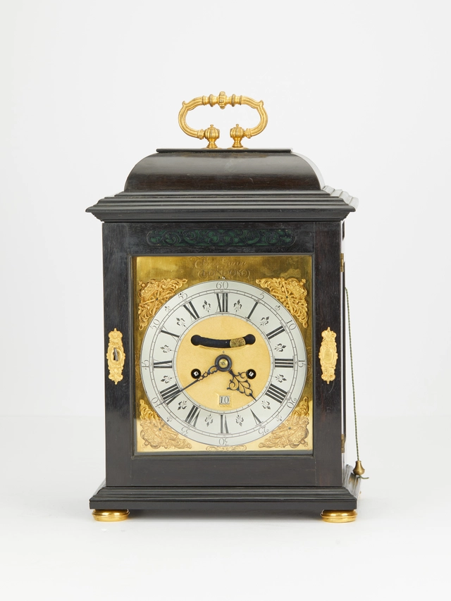 A small English ebonised table clock with moonphase, by Robert Wood, circa 1770