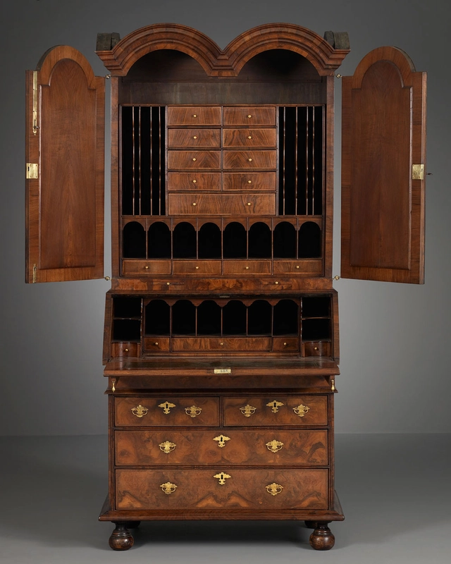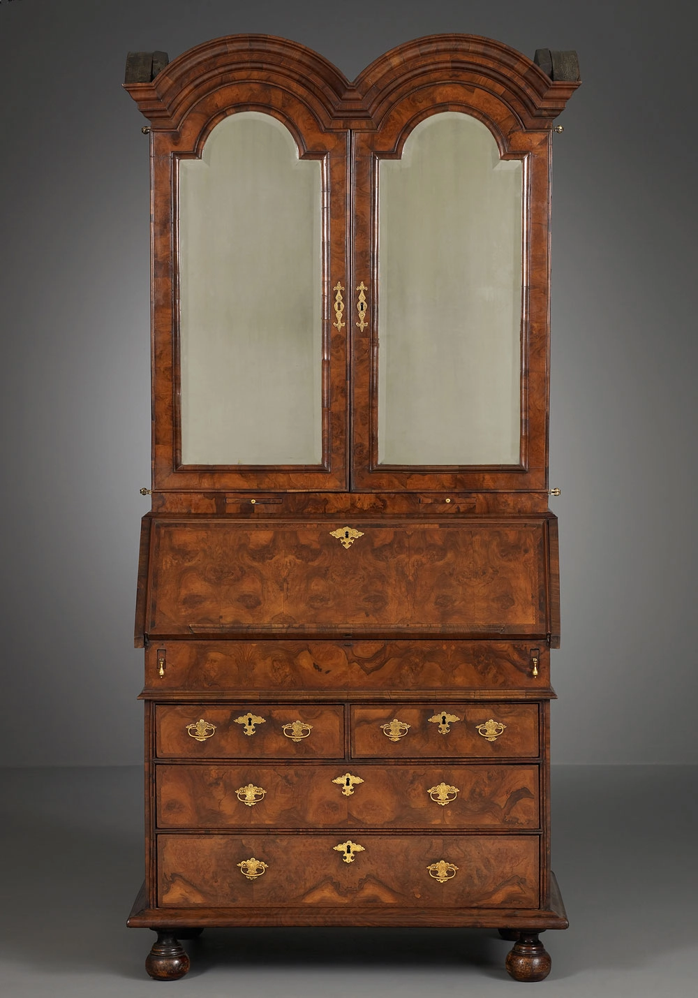 The desk comprises of a bottom and a top cabinet, resting on flattened bun feet. The base cabinet with two short and two long drawers that can be locked. The drawers feature herringbone veneer banding and finely crafted brass key plates and drawer pulls engraved with foliate motifs. The securable, hinged flap with a brass key plate rests on aprons fitted with pear-shaped brass pullers. The exterior of the fall-front can also serve as a music stand.