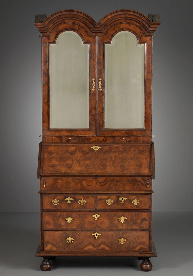 The upper cabinet has two arched doors, decorated by etched mirror plates. The doors turn on knife pivot hinges and can be secured. Both the doors and the mirrors feature arched bevelling. The beautifully moulded hood frame follows the shape of both doors and is double domed. Under the doors two pull-out candle slides, or “tirettes”, to hold candlesticks. The mirrored doors reflect the candlelight and thereby allow the user to read in the evening or write sheet music, for example.