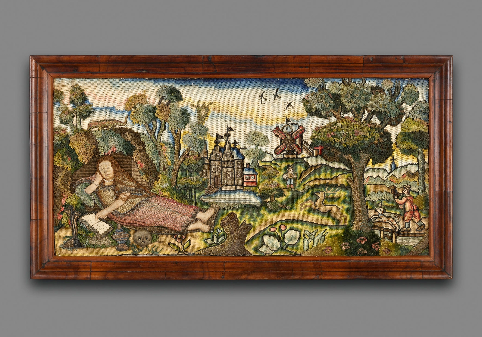An embroidered representation of a reading woman in a landscape. The crucifix, goblet and skull indicate that this is Mary Magdalen. The salamander is a personification of fire; here the representation of the zeal with which she pursued the good after her repentance. The image of a meditating Mary Magdalen stems from the Legenda Aurea, a compilation of hagiographies dating from about 1264 by Jacopo de Voragine (ca. 1230- ca. 1298).
