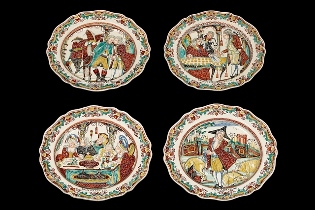 The parable tells of a father with two sons, the youngest of which demands his inheritance from his father. As soon as he receives it, he departs and squanders the money in a foreign land. He becomes a beggar, takes a job as a swineherd and suffers such hunger that he comes to regret his actions. He resolves to return to his father’s home, confess his sins to his father, and beg for a job as a day labourer. When he finally returns home, his father is so overjoyed at his son’s return that he barely lets him speak before rushing him into his home. He dresses his son in fine clothing and calls for a grand feast. When the elder son complains at this behaviour, having always served his father loyally, the father answers: “My son, you are always with me and all that is mine, is yours. But we have no choice but to celebrate and rejoice, for your brother was dead, and is alive again. He was lost, and is found.” The plates, which were made for the Dutch market, form a moralist illustration that depicts the highlights of the story.