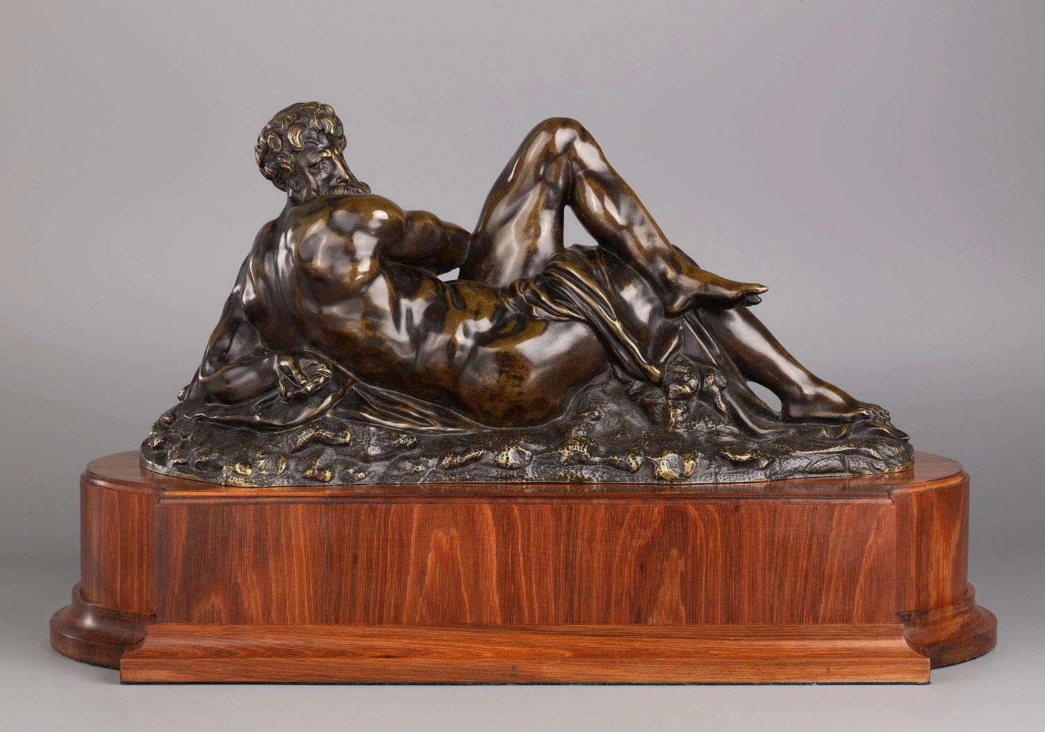 A bronze reduced copy of the statue of ‘Day’ by Michelangelo. The original is to be found in the chapel of the de Medici in the Basilica di San Lorenzo in Florence and is part of the tomb of Guiliano de Medici. Day is depicted as a resting giant in a somewhat force pose.