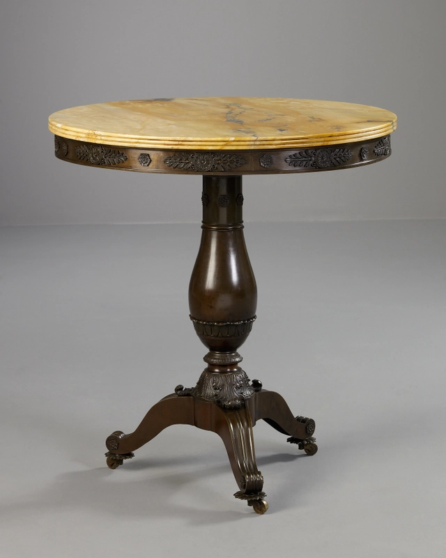 A patinated bronze guéridon with a top of yellow Siena marble with profiled edging.