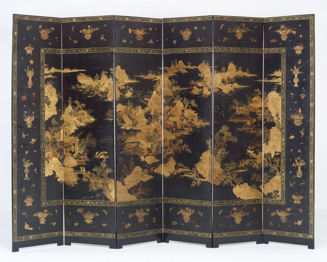 The screen exists of six panels that are connected with hinges and are decorated on both sides with lacquer motives. The decorations are in gold and red lacquer on black in so called makie technique.