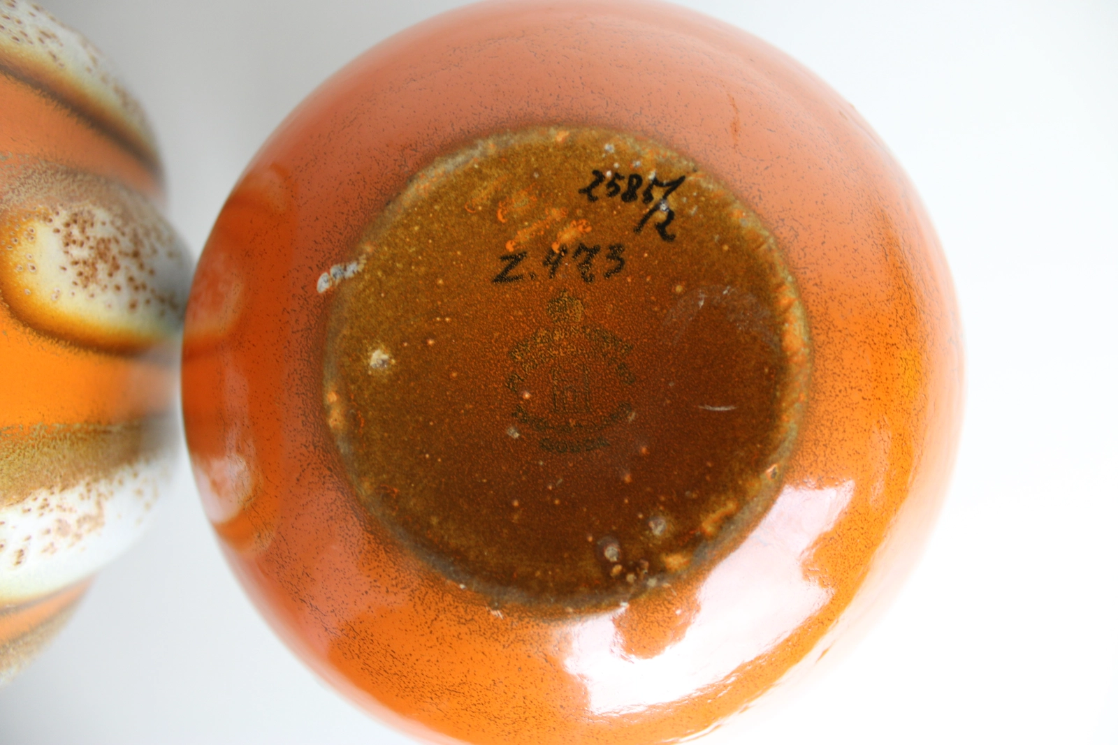 LJ Muller, for plateelbakkerij Zuid-Holland, TWO! pumpkin shaped ball vases with Muvelee decor. Expressionist ceramic design, spherical vase with ribbed sides in orange/grey/brown with Muvelee glaze. Designed by Leendert Johan Muller. Executed by Koninklijke Plateelbakkerij Zuid-Holland Gouda. Marked with number and stamps of Koninklijke Plateelbakkerij Zuid-Holland Gouda. Made around 1928.