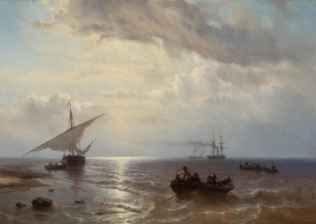 Louis Meijer was a Dutch painter, etcher, lithographer, and draftsman. He was one of the 19th century’s leading Dutch marine painters. He painted in the Romantic tradition and is best known for his seascapes. He was born in Amsterdam. In 1827 he left for France where he practiced landscape painting. In 1831 he returned to Holland and settled in Deventer in 1835, where he stayed until 1839. Initially, Meijer painted landscapes, forest scenes and ice scenes. However, his big breakthrough came when he convincingly depicted the ‘Shipwreck of H.M. Steamboat Willem I on the Lucipara’. This painting immediately brought him great fame and it was logical that Meijer specialized in seascapes around 1839.