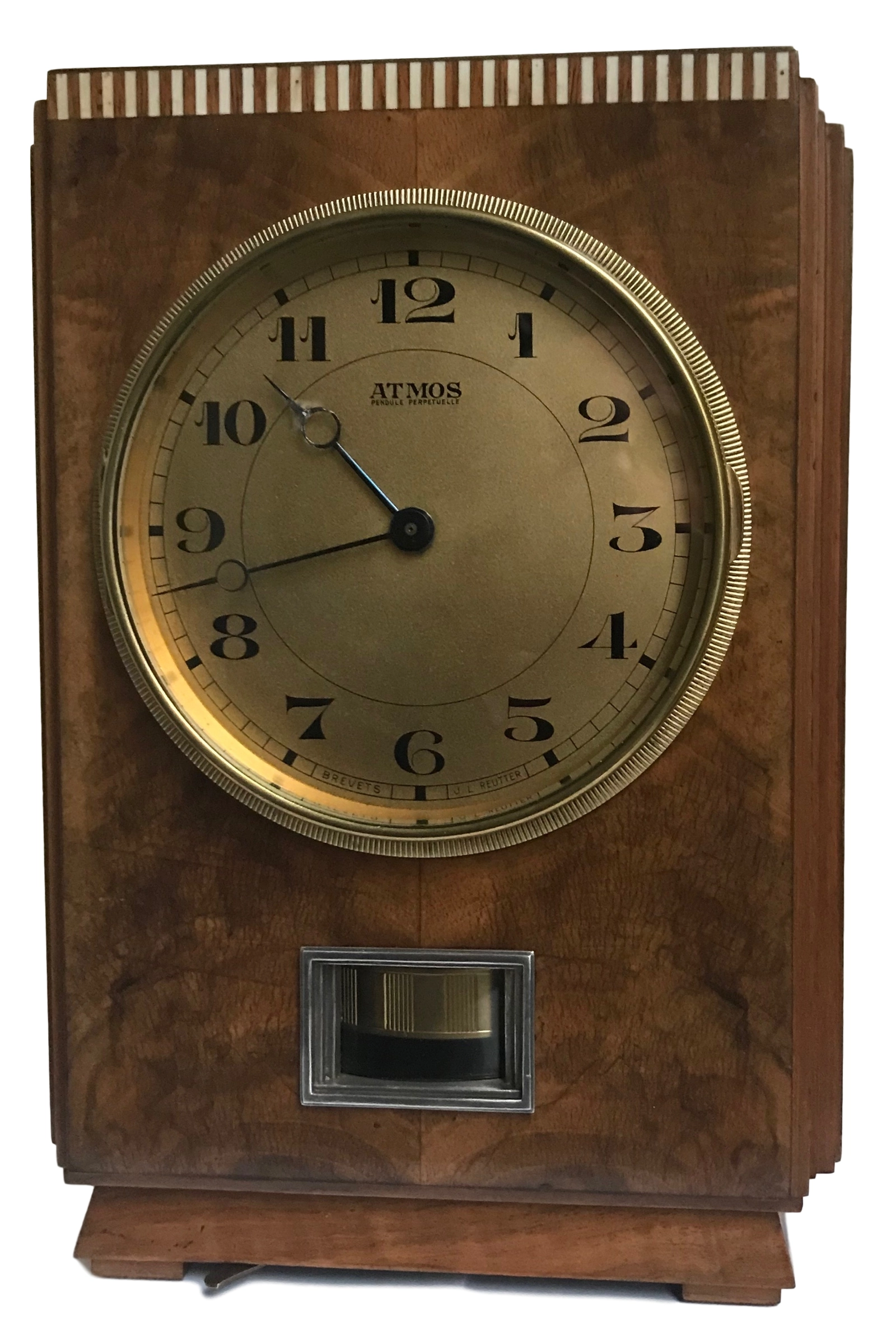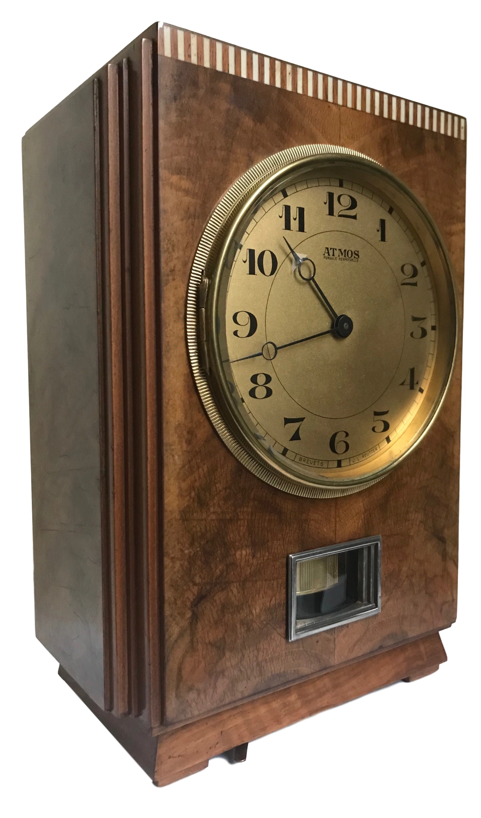 M161 Atmos clock, Amboina wood, J.L. Reutter, number 919, France circa 1930. € 6950 $ 8168 £ 6073 ¥ 1265248 DKK 51928 CHF 6338 NOK 78208 CA$ 11194 HK$ 63833