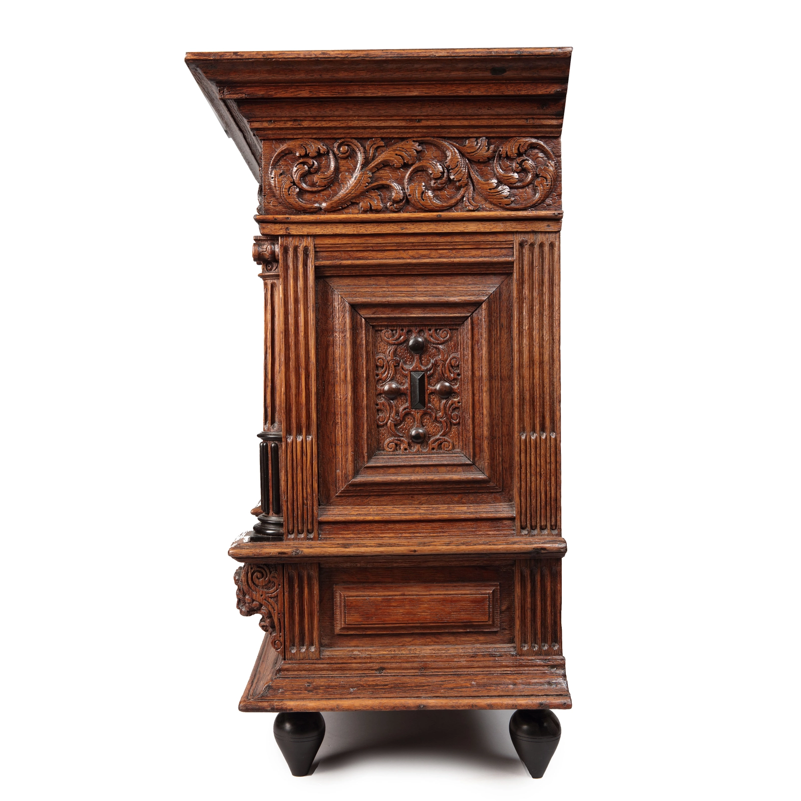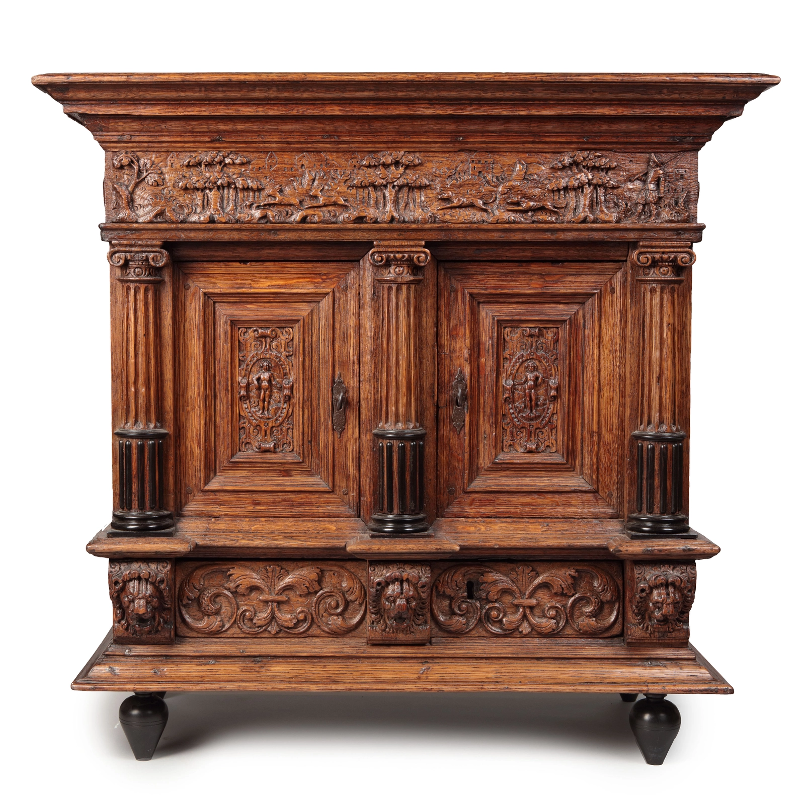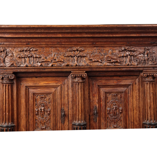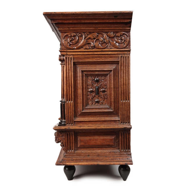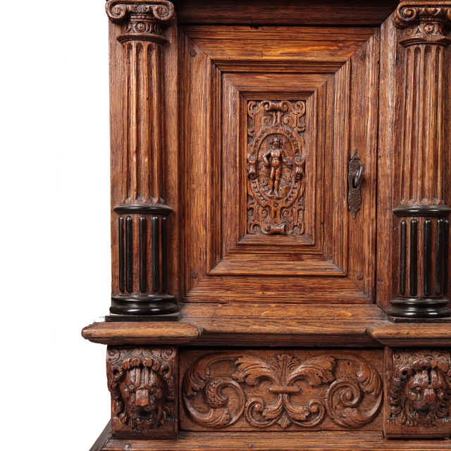 The cabinet is carved with a corniche depicting the hunt at the front, the sides are carved with acanthus leaves. Both panelled doors have putti on a cartouche after Vredeman de Vries. The side panels are carved with motifs and veneered with ebony. The drawer is carved with acanthus leuves marked by three lion heads. These cabinets were most likely a craftsman's masterpiece.