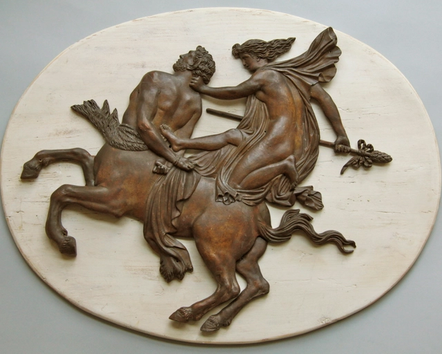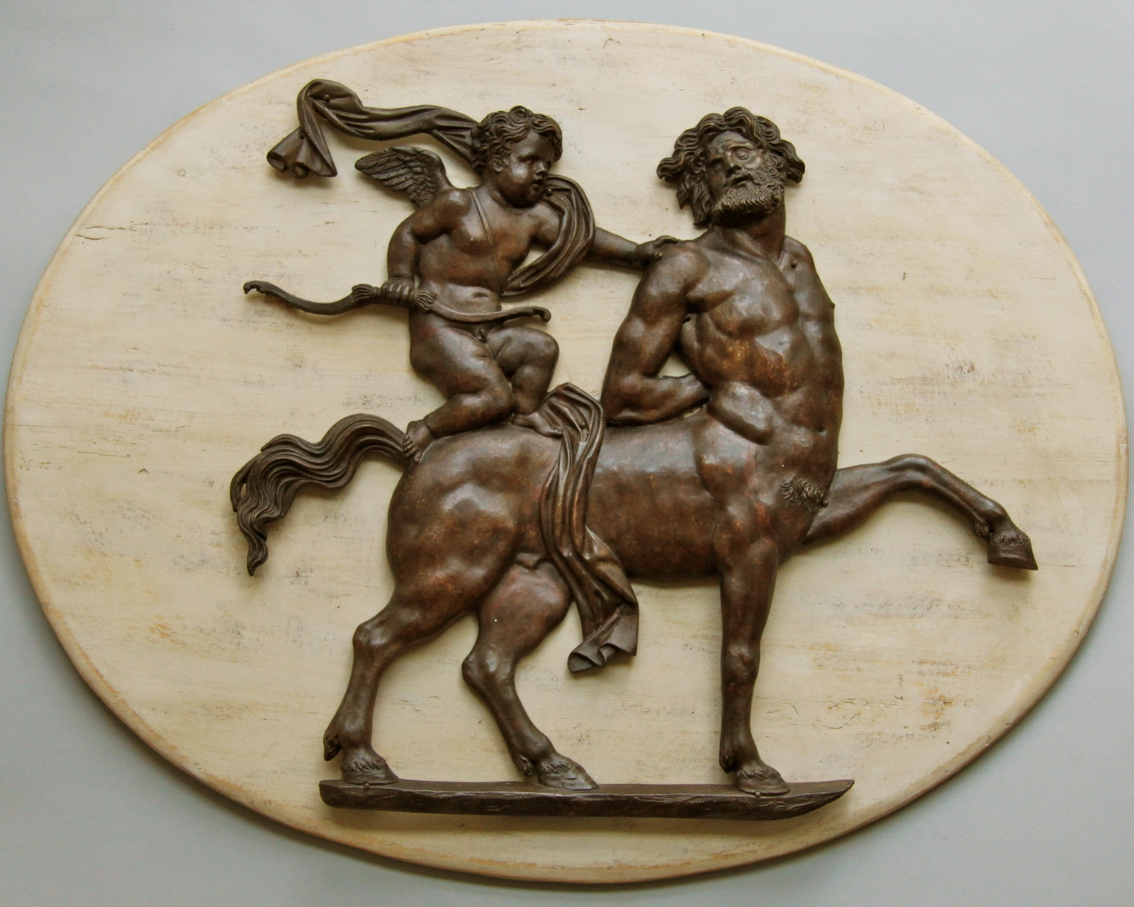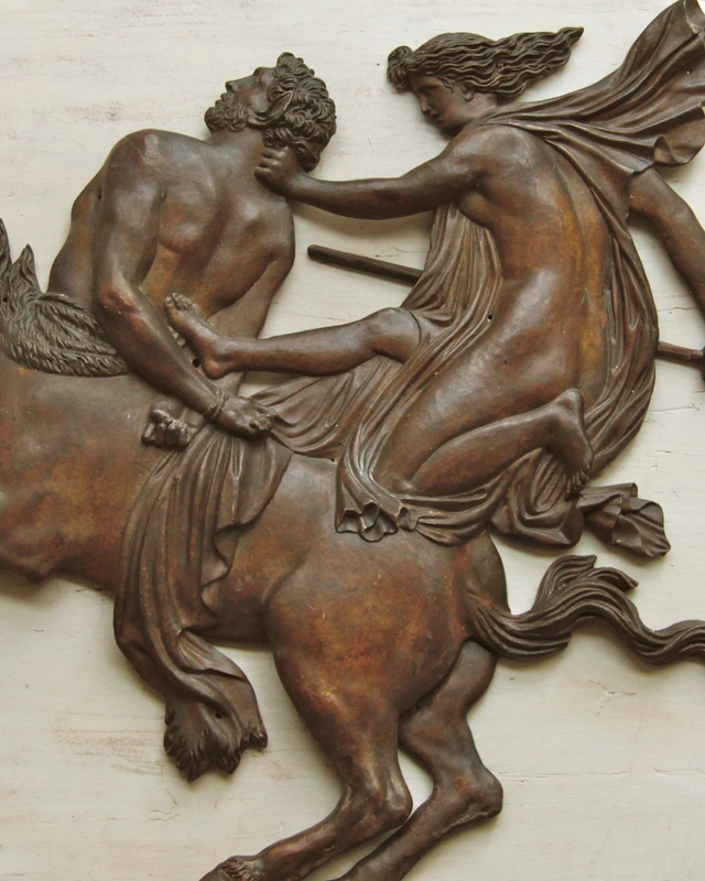 One of the pictures is based on a fresco of a centaur, captured by a bacchante. This fresco was discovered in 1748 in Pompeï. It was already depicted in the series 'Le Antichità di Ercolano Esposte', that was published from 1757 onwards. The other centaur, with Amor on his back, seems to be inspired by the Borghese centaur, a marble statue that was in the Borghese collection and that was bought in 1807 by Napoleon. It is now in the Louvre in Paris. Statues or engravings of Centaurs were beloved objects acquired on Grand Tour in Italy and France.