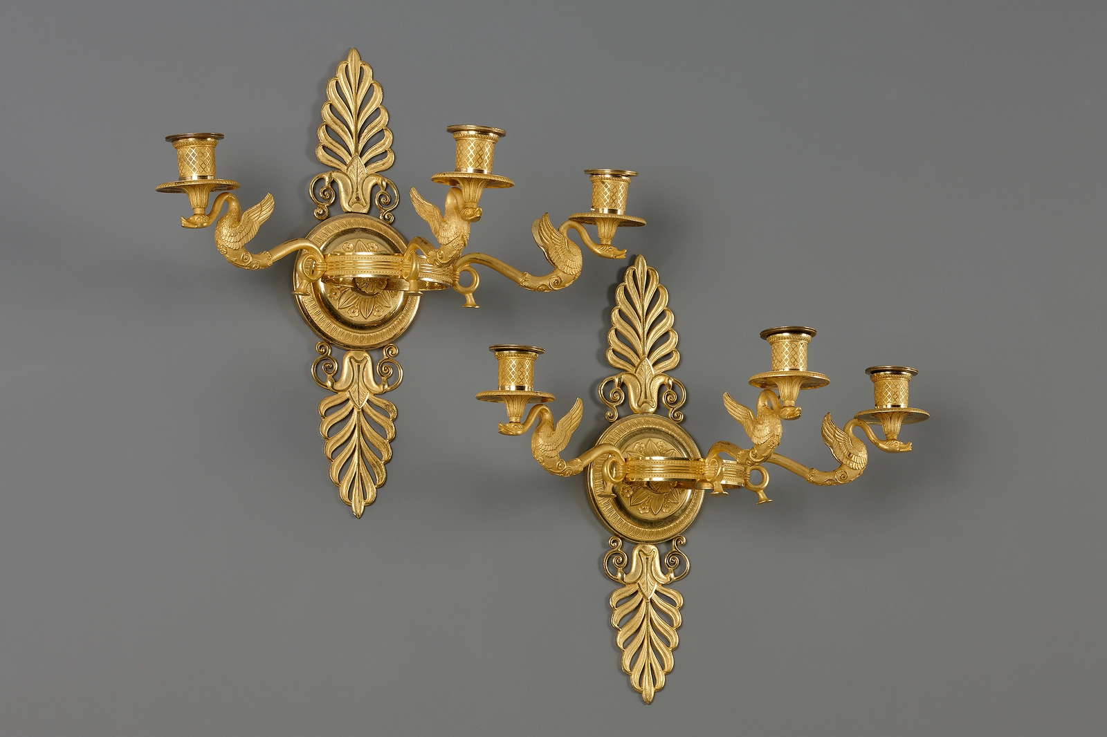 These appliques consist of a round backing plate with a stylized palmette at the top and bottom. The edge of the backing plate is decorated with palmettes. Within this, a stylized composition of flowers and leaves is found. From a round ring mounted on the backing plate, three arms emerge, shaped like stylized swans with outstretched wings, supporting the candleholders with their heads.