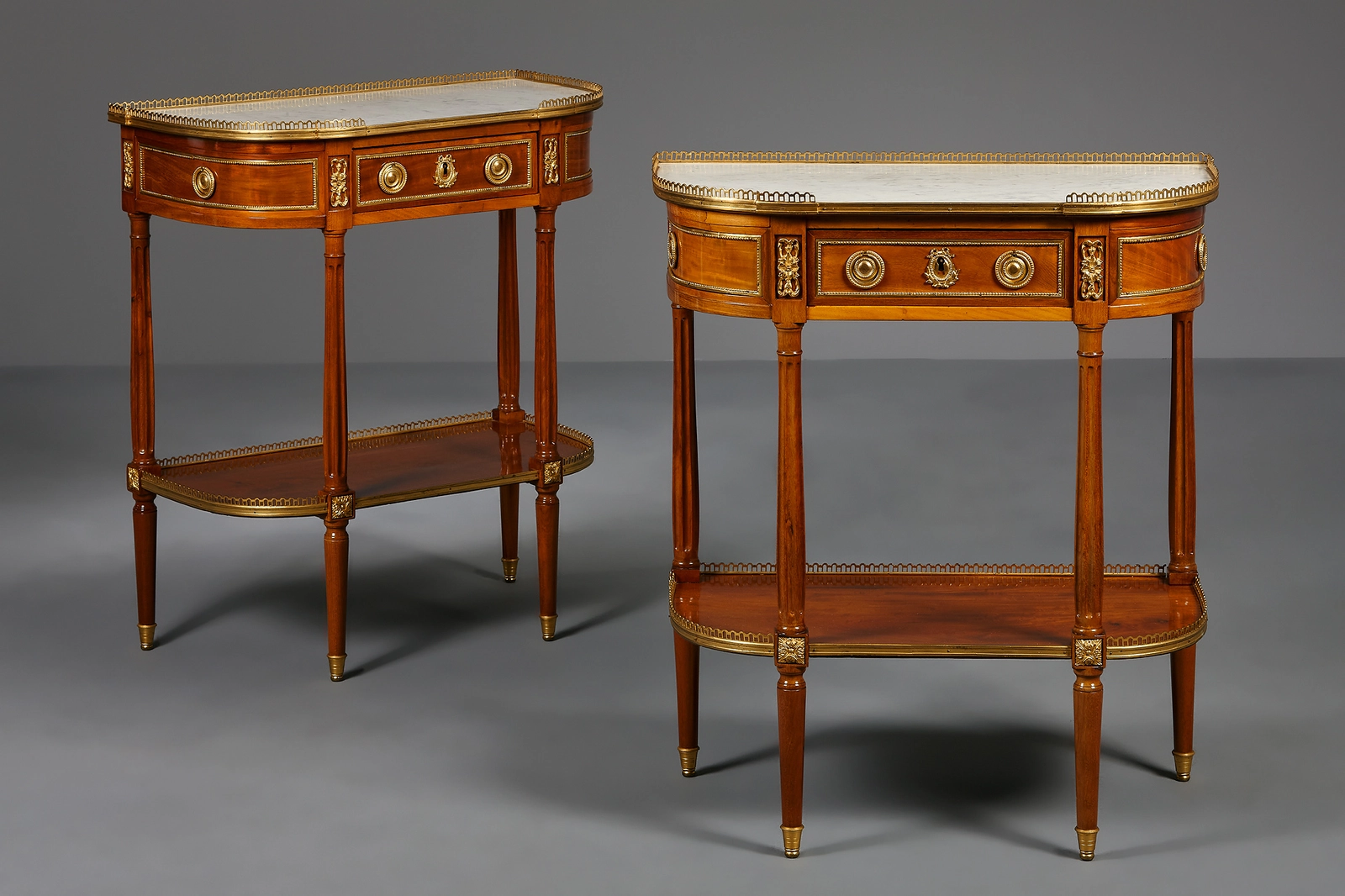 A pair of consoles dessertes, executed in mahogany veneer and with Carrara marble tops. The consoles each stand on four tall slender legs, interrupted by a shelf edged with a gilt bronze border at the front and a gallery rim along the sides and back. At the intersection with the shelf, the legs incorporate blocks decorated with square, fire-gilt bronze rosettes. Above these, the legs are fluted and tapered, narrowing slightly towards the upper side, where they segue into the blocks that form the flanking stiles for the drawer. The blocks are decorated with gilt bronze appliques. The shape of the drawer between the blocks is enhanced by a rectangular pearl border. Within the field enclosed by this border are two round pulls with rings, between which is the key plate with bows and festoons.
