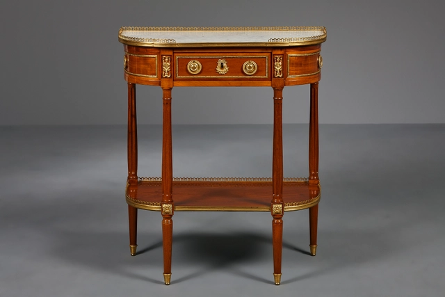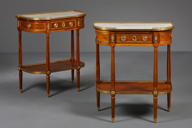 The console desserte emerged during the reign of Louis XVI, along with the appearance of the dining room table. Before then, meals were eaten at tables that were removed afterwards. When the table made its entrance as a fixed item of furniture, other furniture spread around it to complete the furnishings of the dining room.