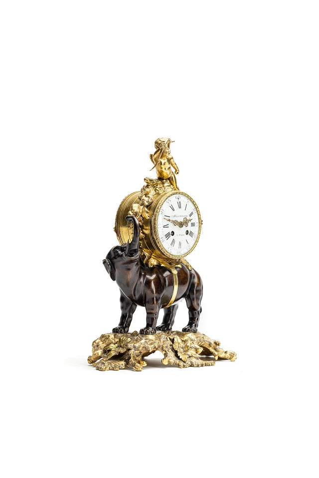 Cute miniature time piece pendulum of a bronze elephant carrying the movement