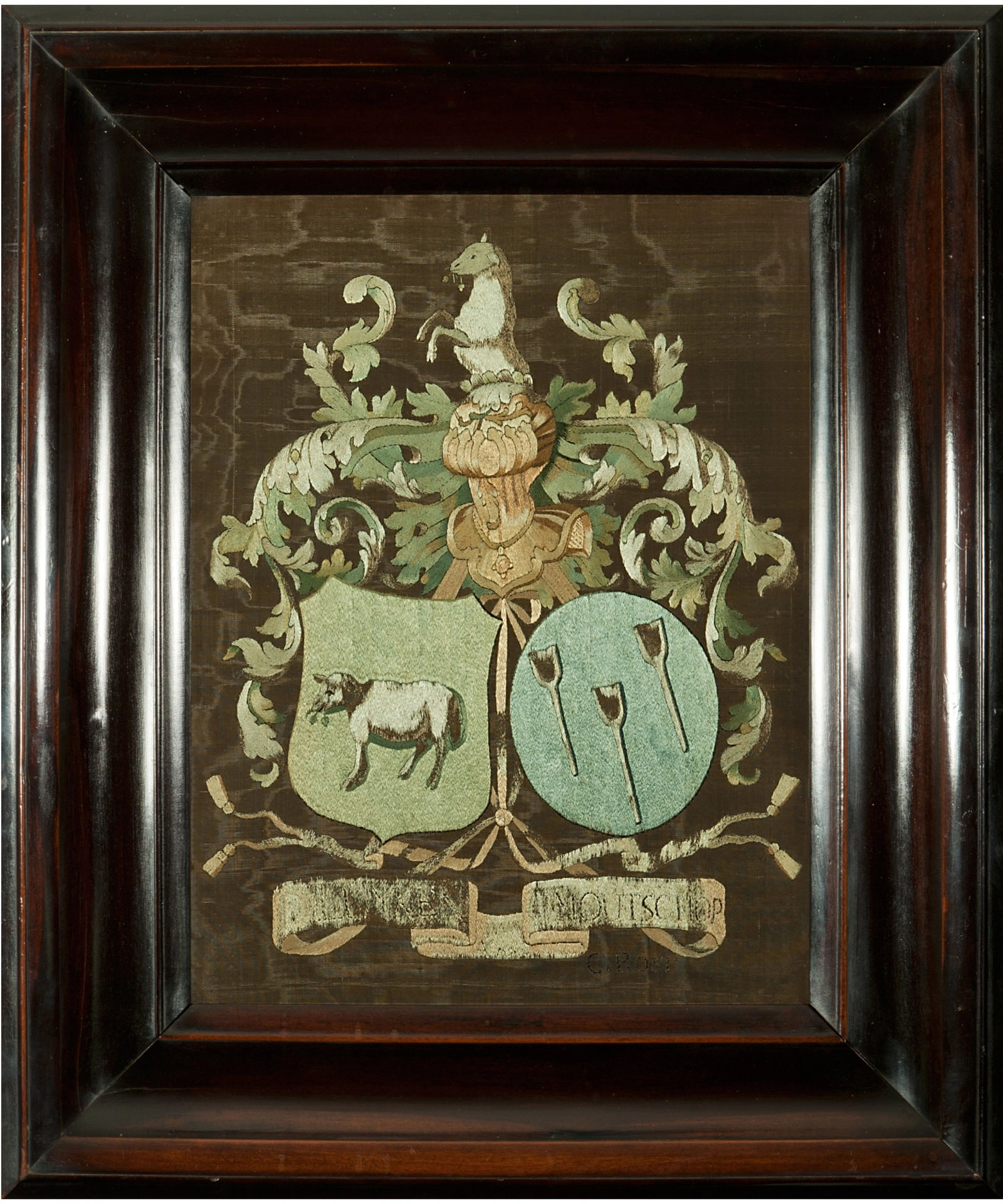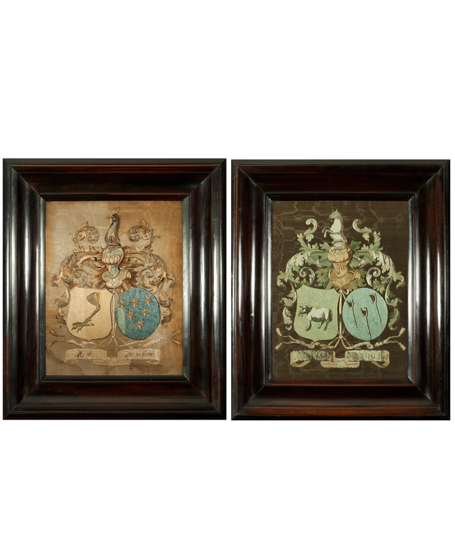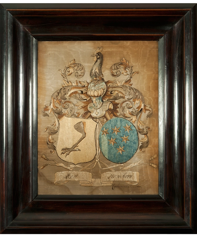 A pair of embroidered wedding signs alliance weapon manufactured by Catherine Rost. This kind of coats of arms was made as a wedding gift. The left coat of arm is from the man the right is the ladies one. Both arms are covered by a fine helmet cloth, from wich the symbols from the man's weapon provides the crowning, here a lamb, a sheep and a the head of a cock. Below the weapons a ribbon and on which the family name appears. In the middle year of the wedding (1686 and 1693). On one board, the names Luyken and Malt Shovel for covering Geertruyd Malt Shovel, born in Alkmaar in 1661, and Daniel Luyken (Amsterdam 1659-1741 The Hague). Daniel Luyken was a lawyer at the Court of Holland. Some sources say that Geertruyd died in 1775, but that seems impossible, since she would have become 114 years old and therefore probably the oldest citizen of Holland. Other sources mention that she remarried a certain Abraham Douglas in The Hague, which was the agent of the King of Prussia. Geertruyd was the daughter of Gerrit Malt Shovel and Elisabeth Stamhorst. She died in 1755 in The Hague. The name Stamhorst also occurs on other wedding board in combination with Elisabeth van Stamhorst. Probably this is Meijndert Rost and Elisabeth Stam Horst, the date on this board is 1693. It is not known exactly when they got married. Probably Catherine Rost, the embroiderer, a relative or a daughter.