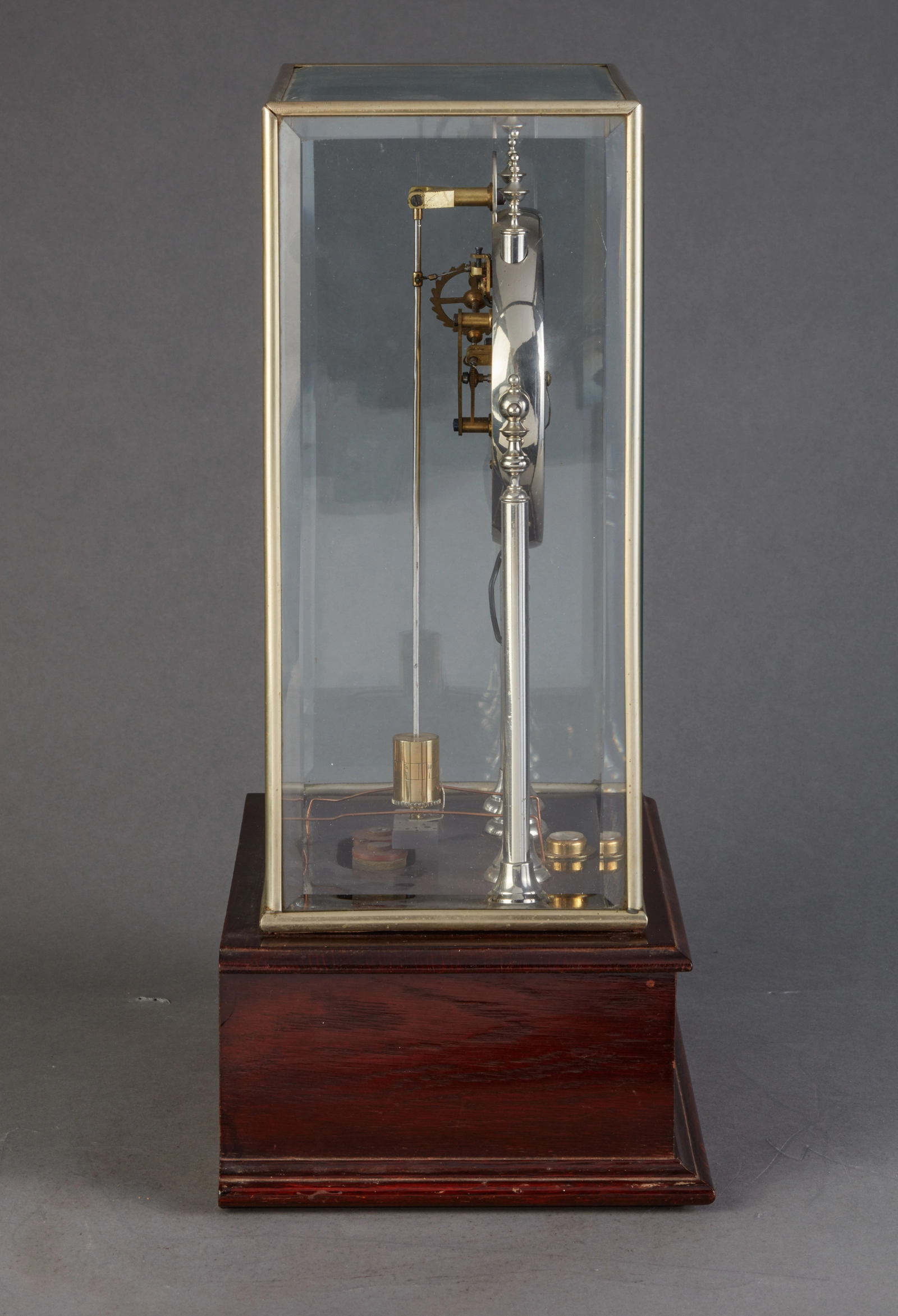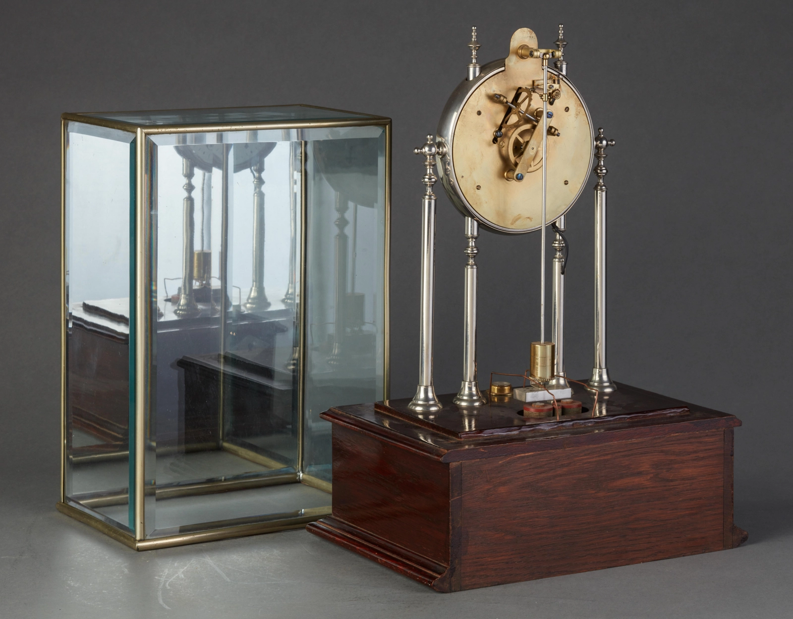 Untouched four glass electrical mantel clock from "Scott". The lovely well figured mahogany base together with the original brass nickel plated dome, the clock is in a good condition, circa 1910.